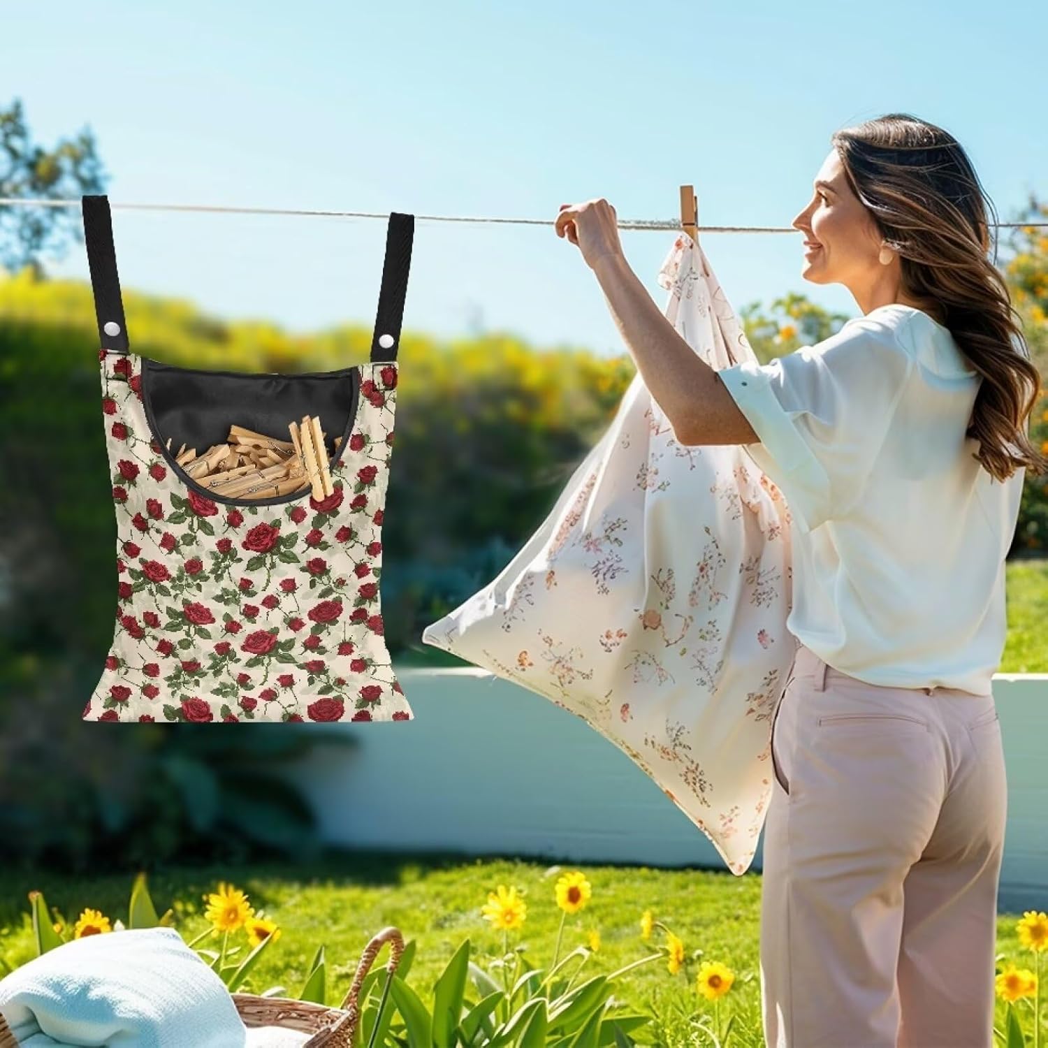 Rose Clothespin Bag Fashion Hanging Storage Organizer Clothes Pin Bag Waterproof Laundry Clothespin Bag Clothespin Holder with Hanger Hook for Easy Hang and Large Opening