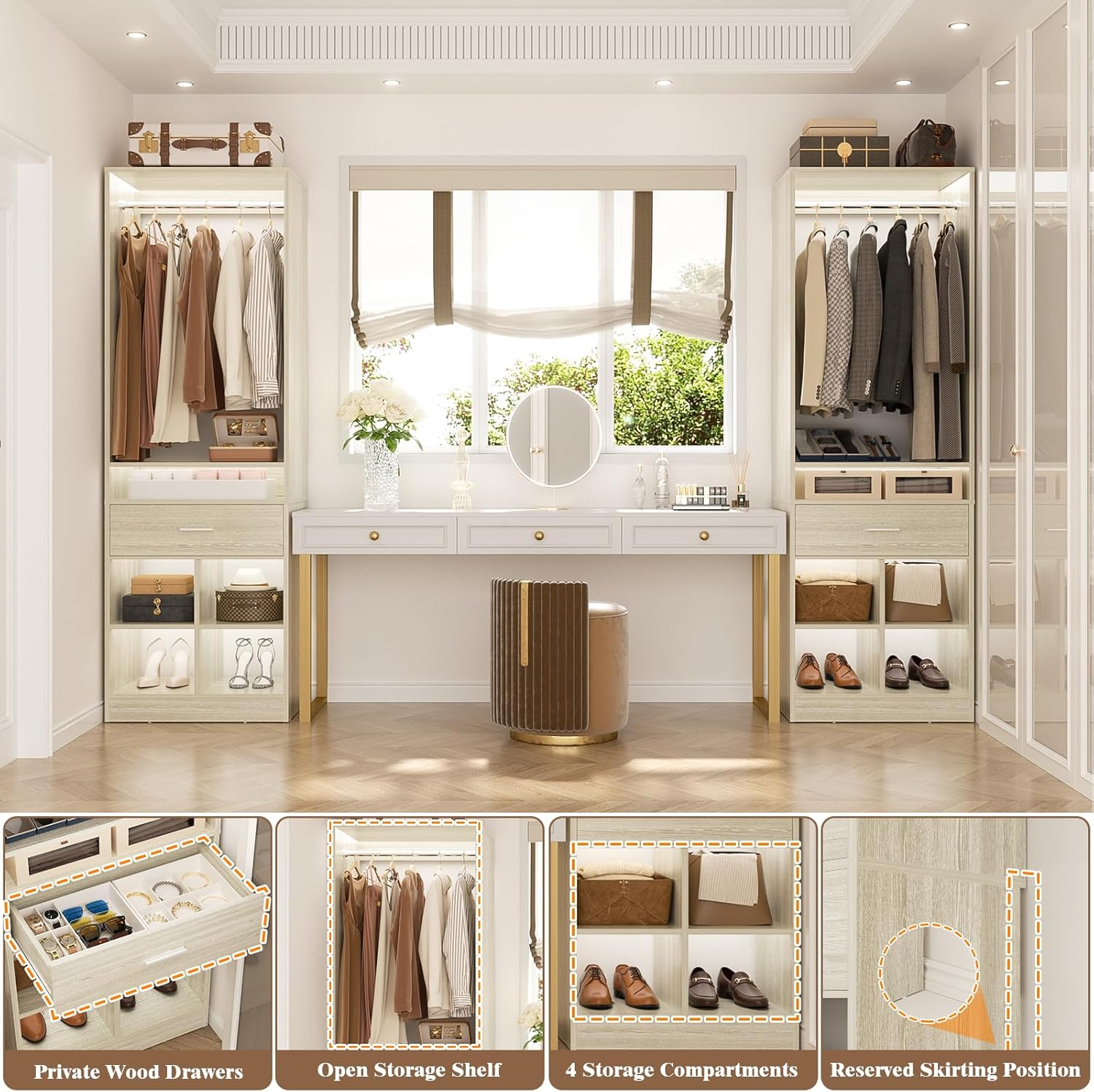 Unikito Freestanding Closet System with Wood Drawer and 4 Cubby Storage, Closet Organizer with Hanging Rods & Shelves, 25‘’W X 80'' H Clothes Garment Rack, Walk in Closet Tower Wardrobe, White Oak