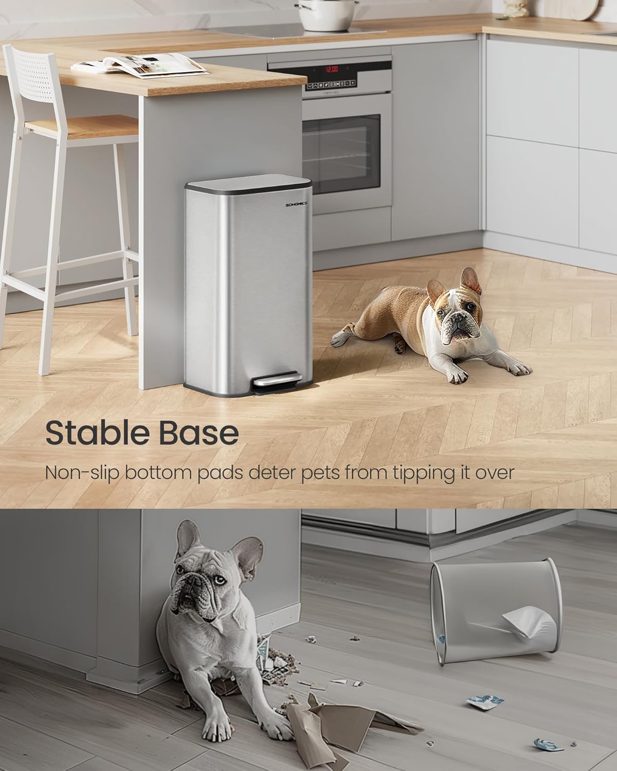 - [Durable and Stable] Made from robust stainless steel, this trash bin is resistant to rust, dirt, and is easy to clean. The base is equipped with non-slip pads to enhance stability, making it difficult for pets to tip it over