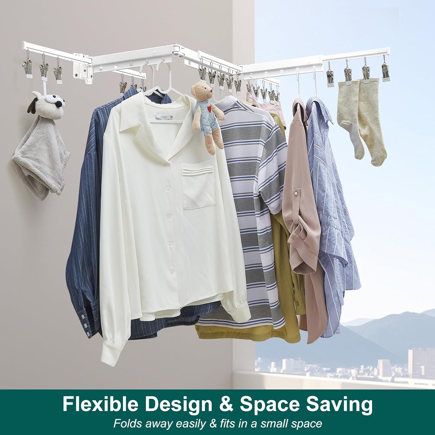- Versatile Applications: Comes with 15 hanging holes for larger garments and 20 removable clips for smaller garments like socks, so you can hang tons of clothes at the same time. Its wall-mounted nature allows for installation anywhere.