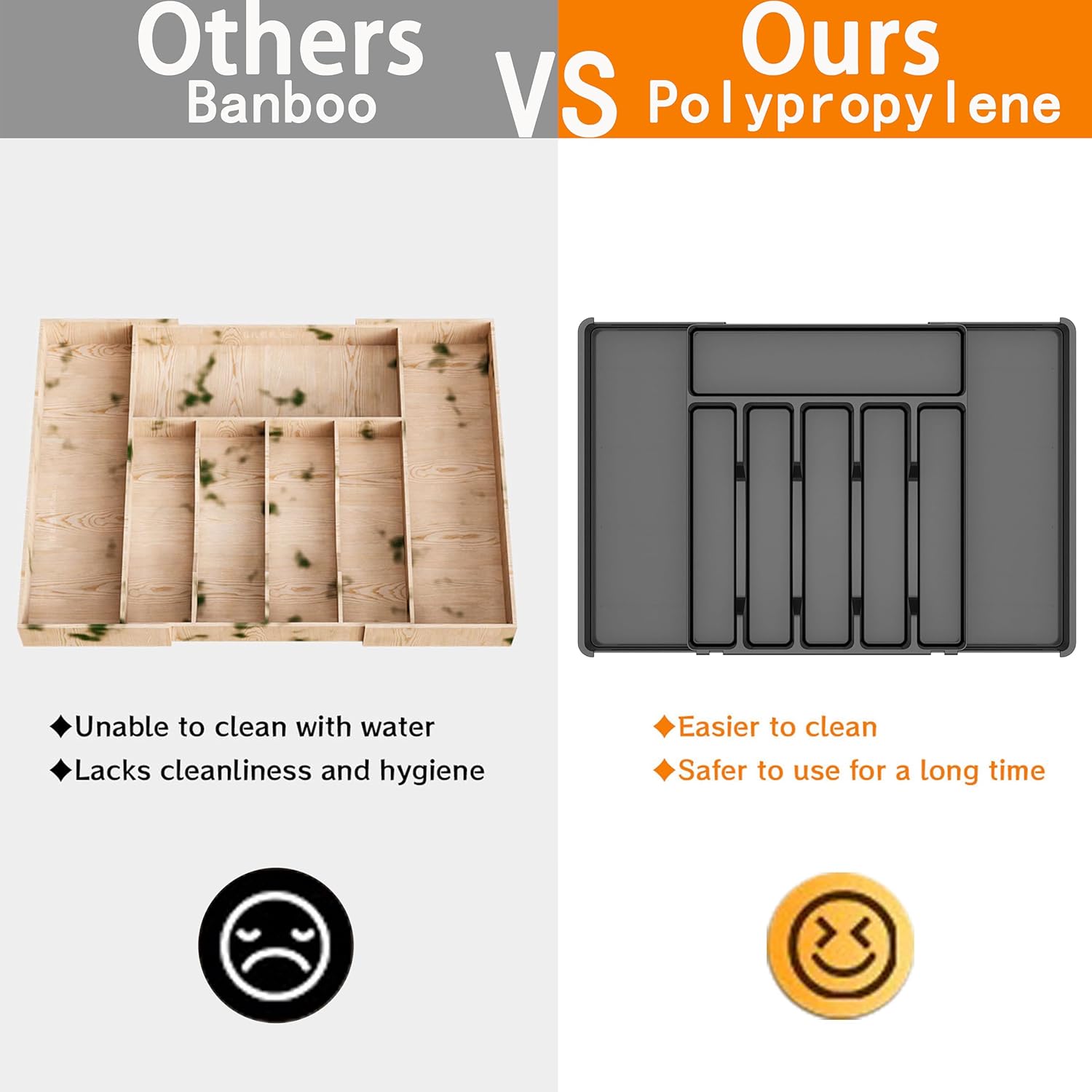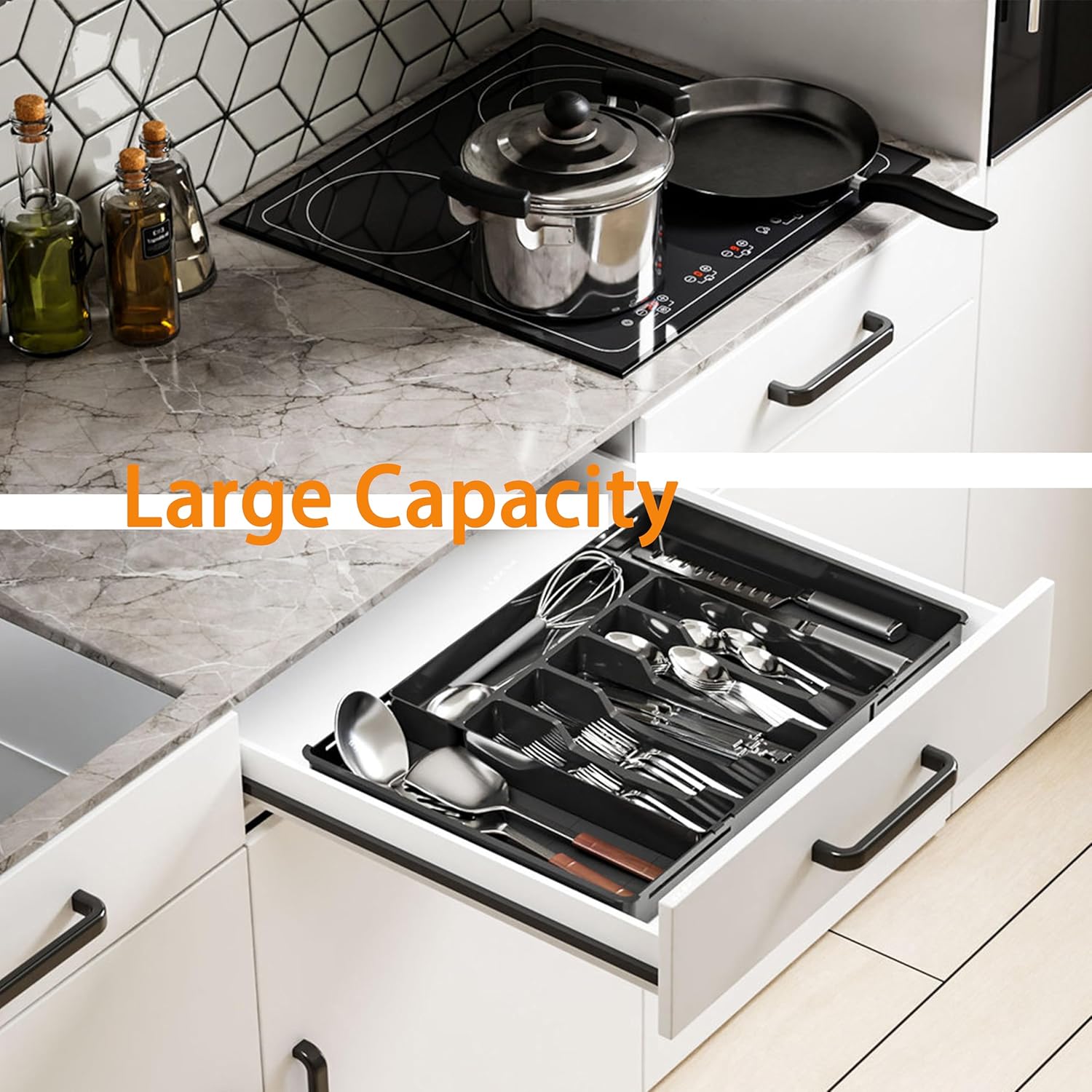 - Large Capacity:Keep your kitchen drawer organized and create more space with this silverware organizer. Features two expandable panels on the left and right to accommodate additional silverware,cutlery,and kitchen utensils