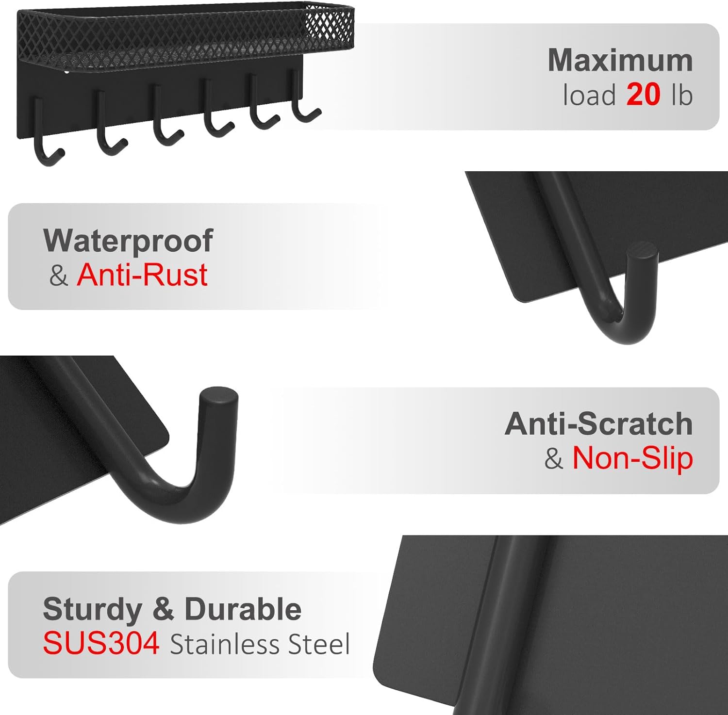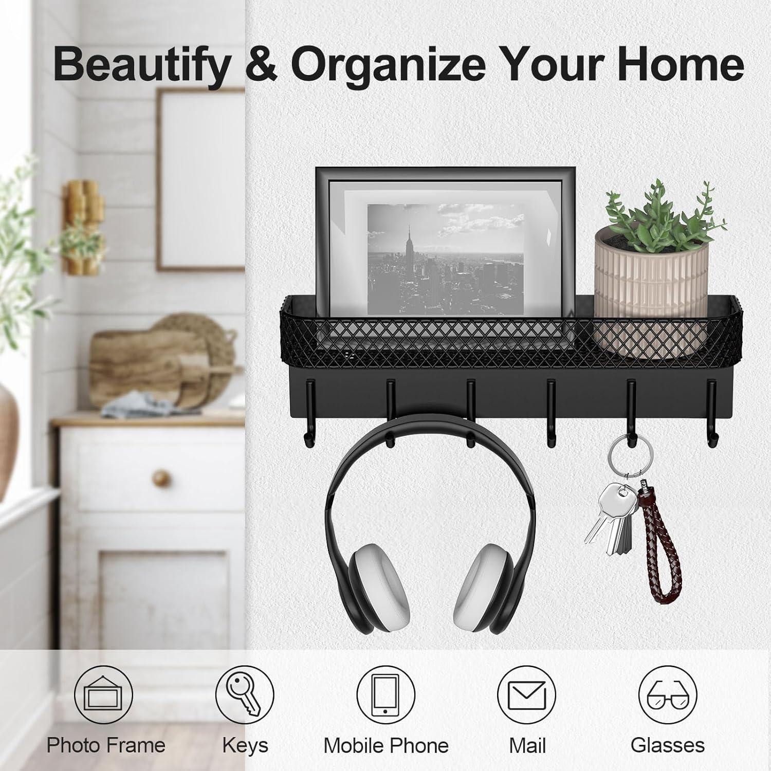 - MAIL HOLDER AND KEY RACK organizes any room instantly. Keep keyrings, sunglasses and other items organized and within reach of the front door, work desk, stove or shower with 6 sturdy key hooks.