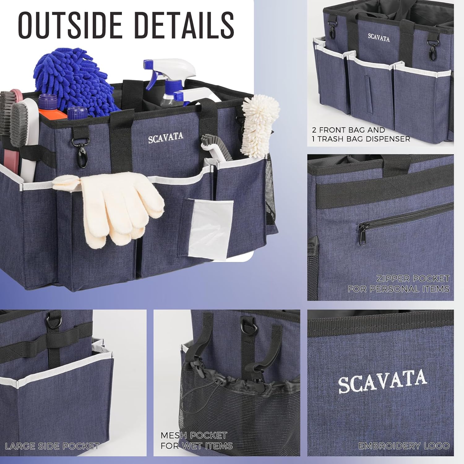 - Exquisite Details: The 5 inner compartments are large enough for organizing cleaning tools. 3 individual deep outer pockets, 1 mesh side pocket and 1 trash bag dispenser allow you storage and access of other cleaning tools. Also, securely zipped pocket is design for safely storing your important items