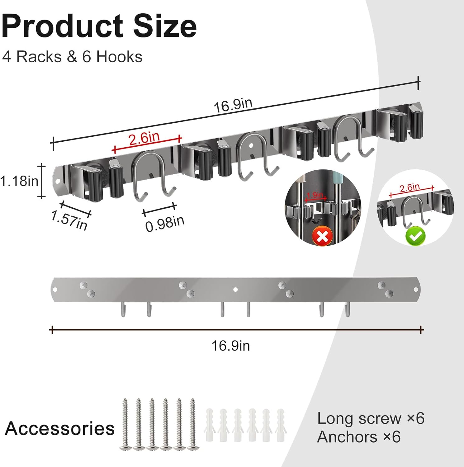 - Spacious 6-Hook Mop Holder: Features 4 slots and 6 hooks with smart spacing (5.12" slots, 4.72" hooks) for maximum storage. Saves space while holding multiple brooms, mops and tools effortlessly