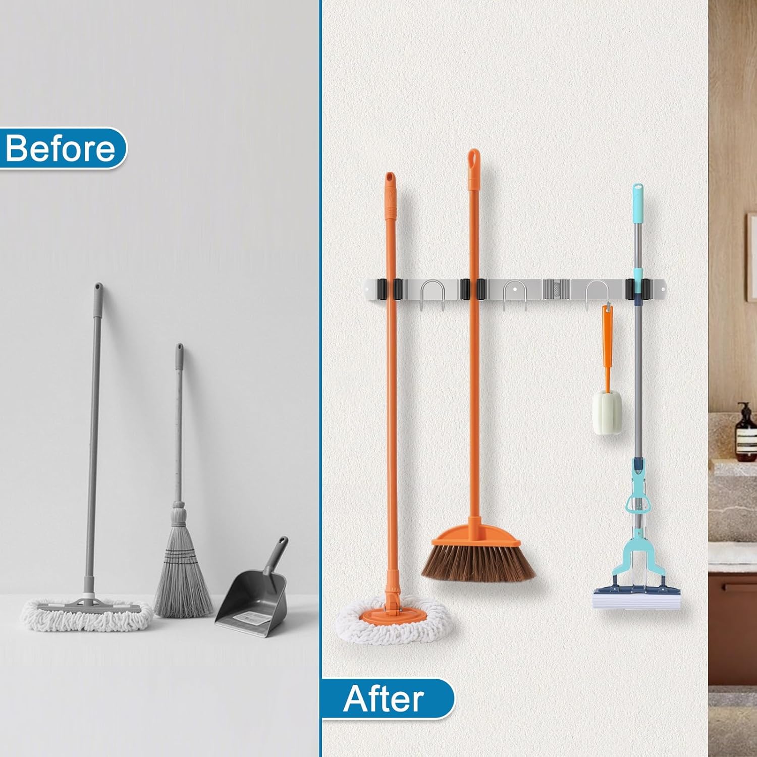 - Versatile Multi-Space Organizer: Perfect for kitchens, bathrooms, laundry rooms, garages, and RVs. This heavy-duty holder keeps brooms, mops and tools neatly stored anywhere you need
