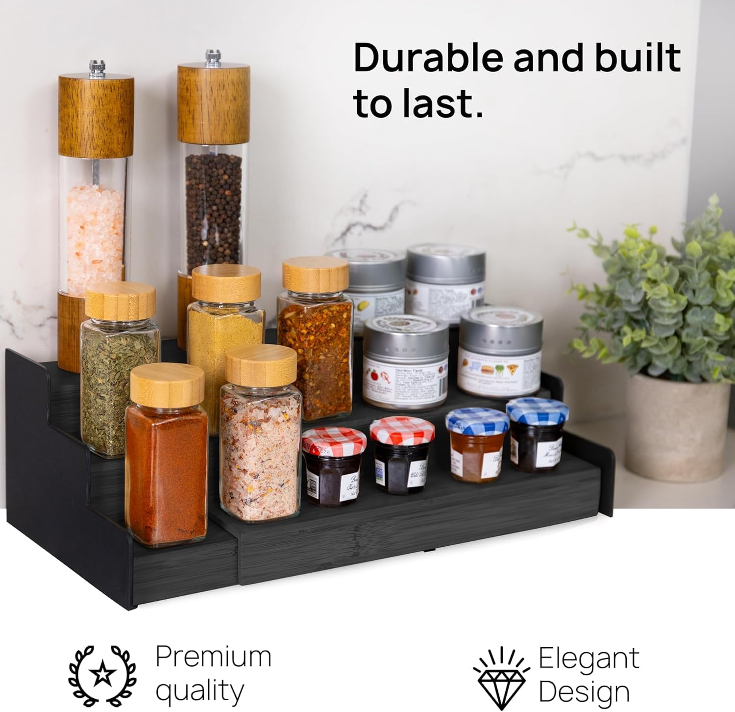 - ππ π ππππππ πππππ ππππππ - This spice rack for cabinet features a convenient extendable design and has a width range of 12.2"-20.0" allowing you to easily adjust the rack according to your needs. Top tier has 3.4" Depth, Middle & Bottom Tiers have 3.2" Depth to accommodate maximum accessories!