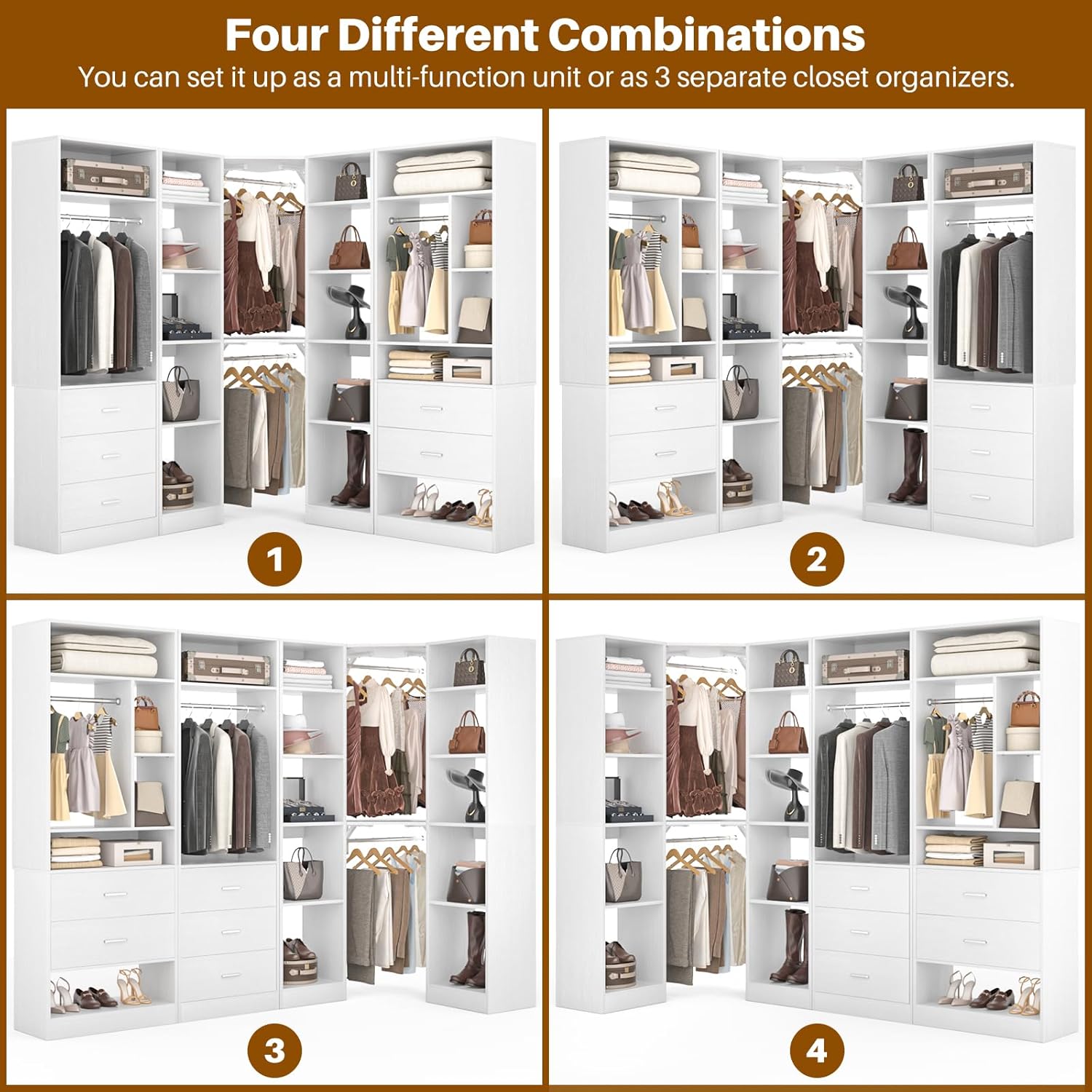 - DIY Customize Your Dream Walk-in Closet: Our closet systems put the design in your hands, allowing you to DIY to your liking. You have the flexibility to mix and match different modules based on room size, personal style and storage requirements to create an dreamful L- or U-shaped walk-in closet.