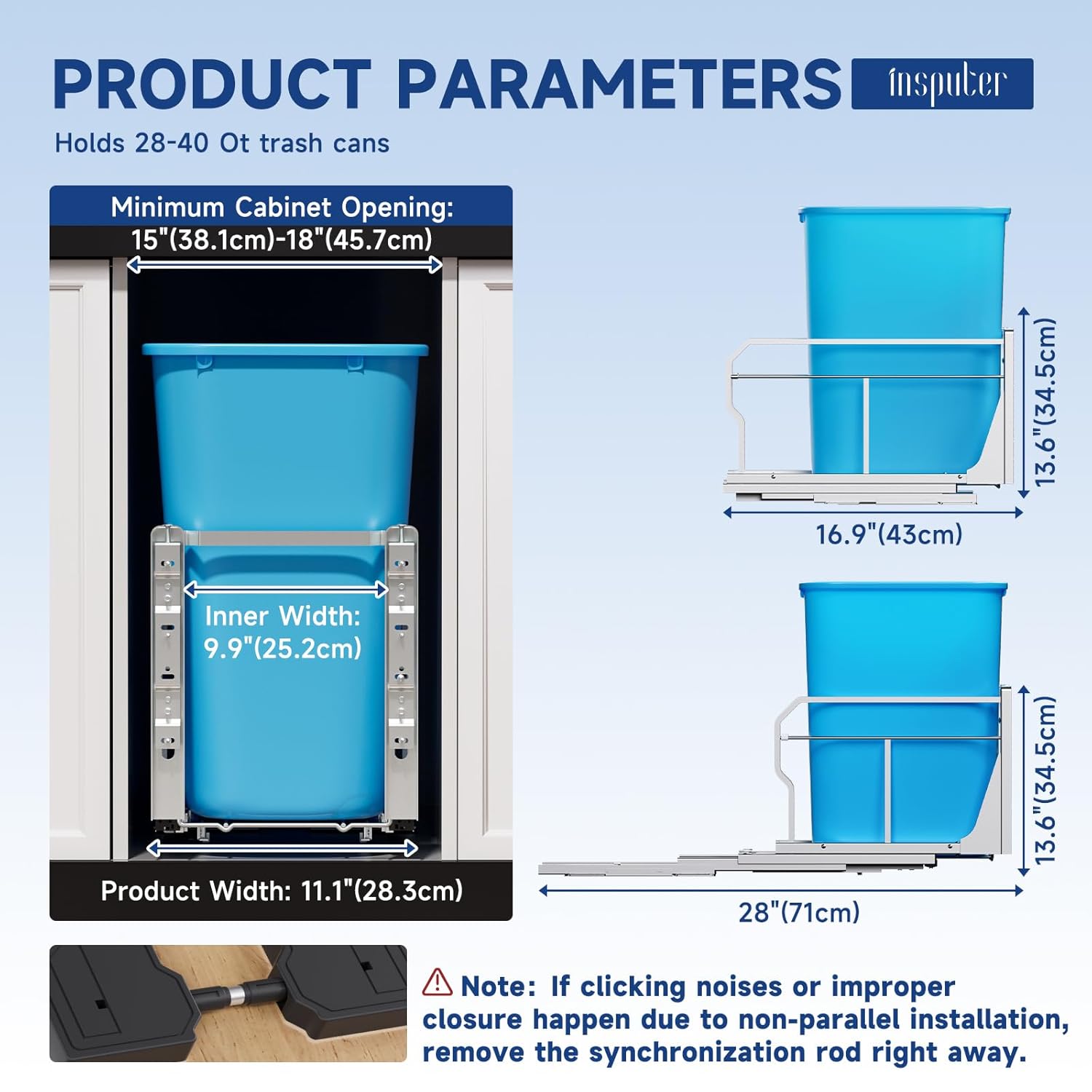 - Soft-closing slides: Don't worry about damaging your cabinets by pushing hard on the doors! Insputer cabinet trash can pullout kit uses better quality damping slides with soft closing function, which has great advantages in reducing noise and running smoothly