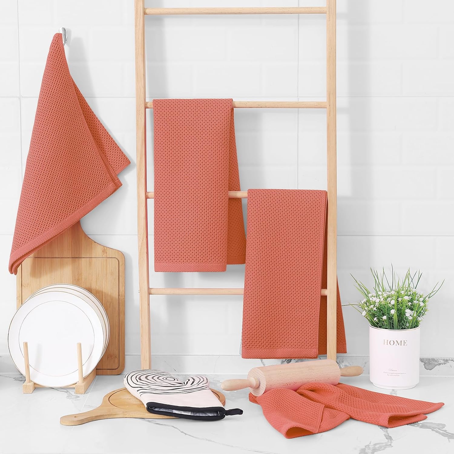 Homaxy 100% Cotton Waffle Weave Kitchen Dish Towels, Ultra Soft Absorbent Quick Drying Cleaning Towel, 13 x 28 Inches, 6-Pack, Coral