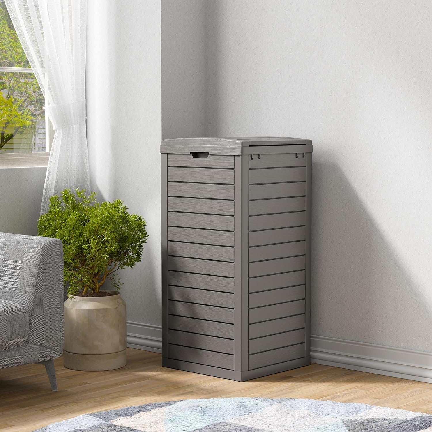 - Waterproof Material - The outdoor garbage can is made of stable and recyclable resin material that is waterproof and fade resistant. The panels are sturdy and will not bend, warp or break easily and are highly weather resistant.