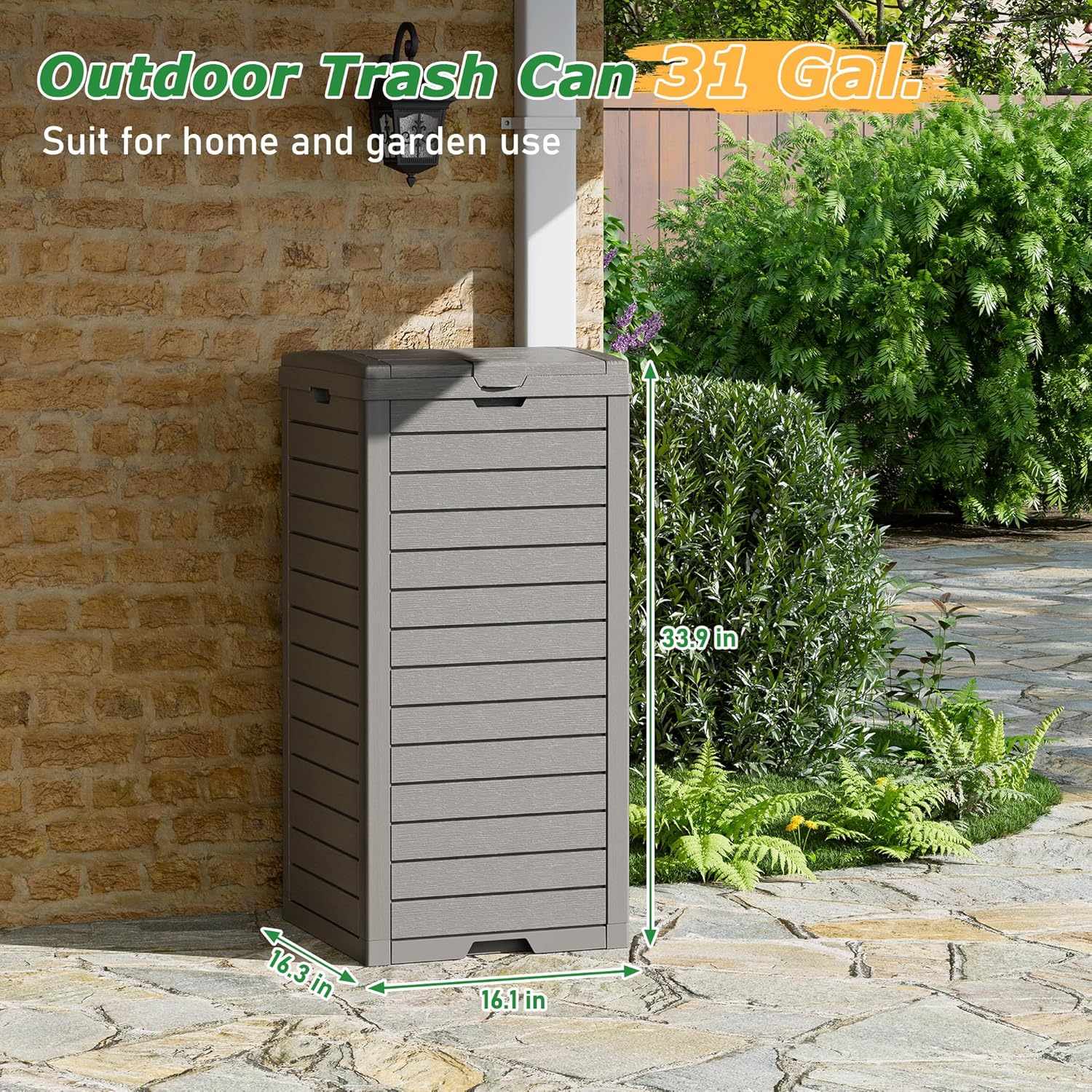 - 31 Gal Capacity - 16.10*16.26*33.86 in, compatible with 33-40 gallon trash bags-43~47"L*28~30"W, the outdoor trash can is suitable for storing indoor and outdoor trash and keeping the house and patio clean.