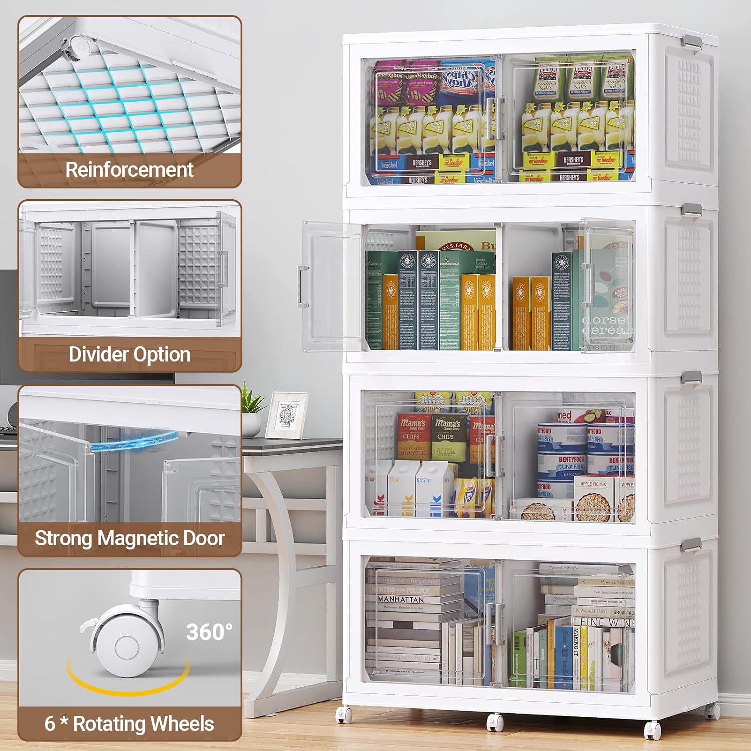 - 【Foldable, Stackable, Easy Assembly 】Storage bins can be collapsible, When not in use, they can be folded up to save space; It also can be stacked layer by layer into a cabinet, with side buckles to secure each level, preventing tipping or scattering. The large storage box has 6pcs 360° rotating wheels, allowing easy movement—an essential large storage bin for homes and dorms. You can quickly unfold or collapse in just 5 minutes. (Note: need to insert door/side handles by yourself)