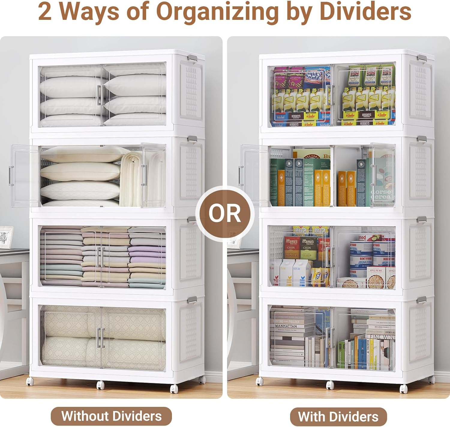 - 【Extra-Large Storage Bins With Dividers】BROVIEW storage bins offer an astonishing capacity of 200Qt/50Gal per tier. 4Pack foldable storage bin, equipped with doors and wheels, expands to generous dimensions of 33.5"L x 19"W x 69.3"H and can support a maximum weight of up to 120lb. Each tier is thoughtfully designed with a divider, enabling you to create two distinct compartments within a single level for organized storage. (Note: Each set includes ONLY ONE LID!)