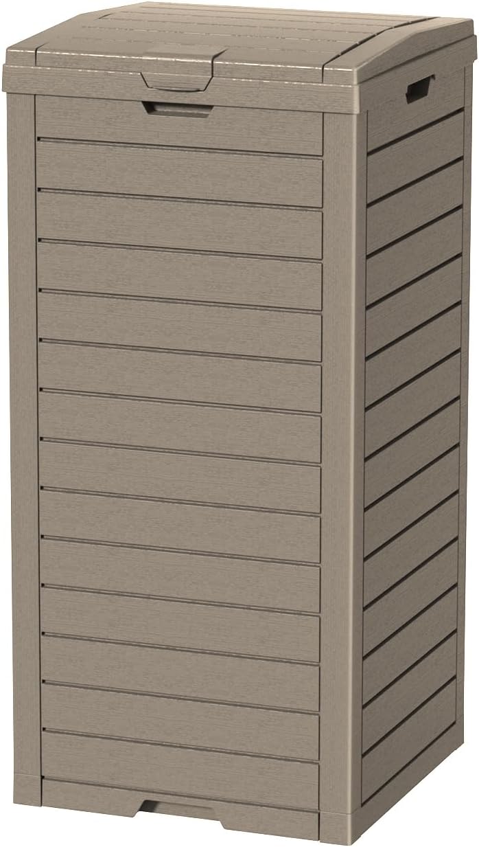 - Durable and Waterproof Material: Made from durable, recyclable resin, this outdoor trashcan is waterproof and fade-resistant. The sturdy panels are resistant to bending, warping, or breaking, providing excellent weather resistance to withstand various weather conditions.