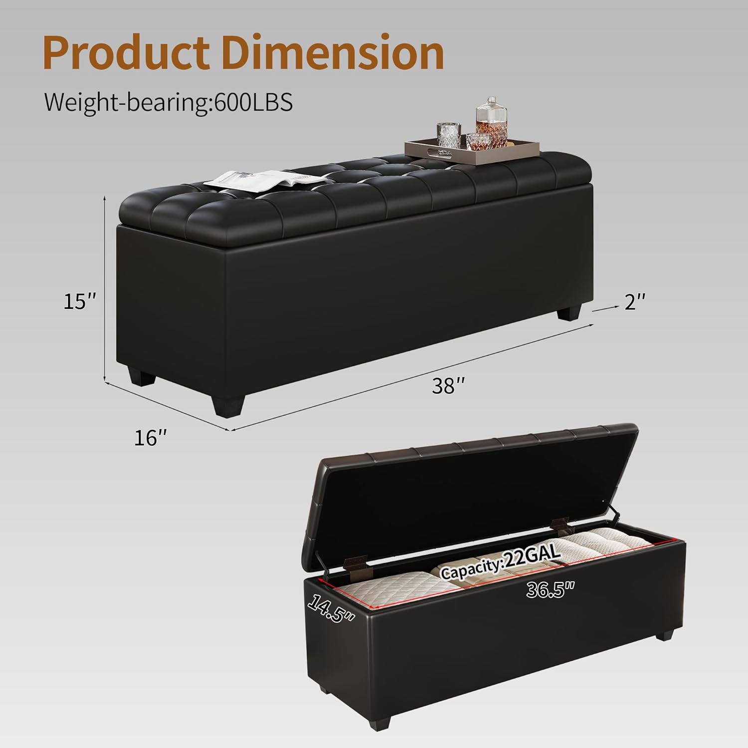- 【 Spacious Storage 】 About 36.2" x 14.5" x 9.4" as its inner storage size,this 38 inch long storage ottoman bench with hinged lid provides you with lots of area to store things like toys,books,clothes,backpacks,blankets,shoes,seasonal items and more