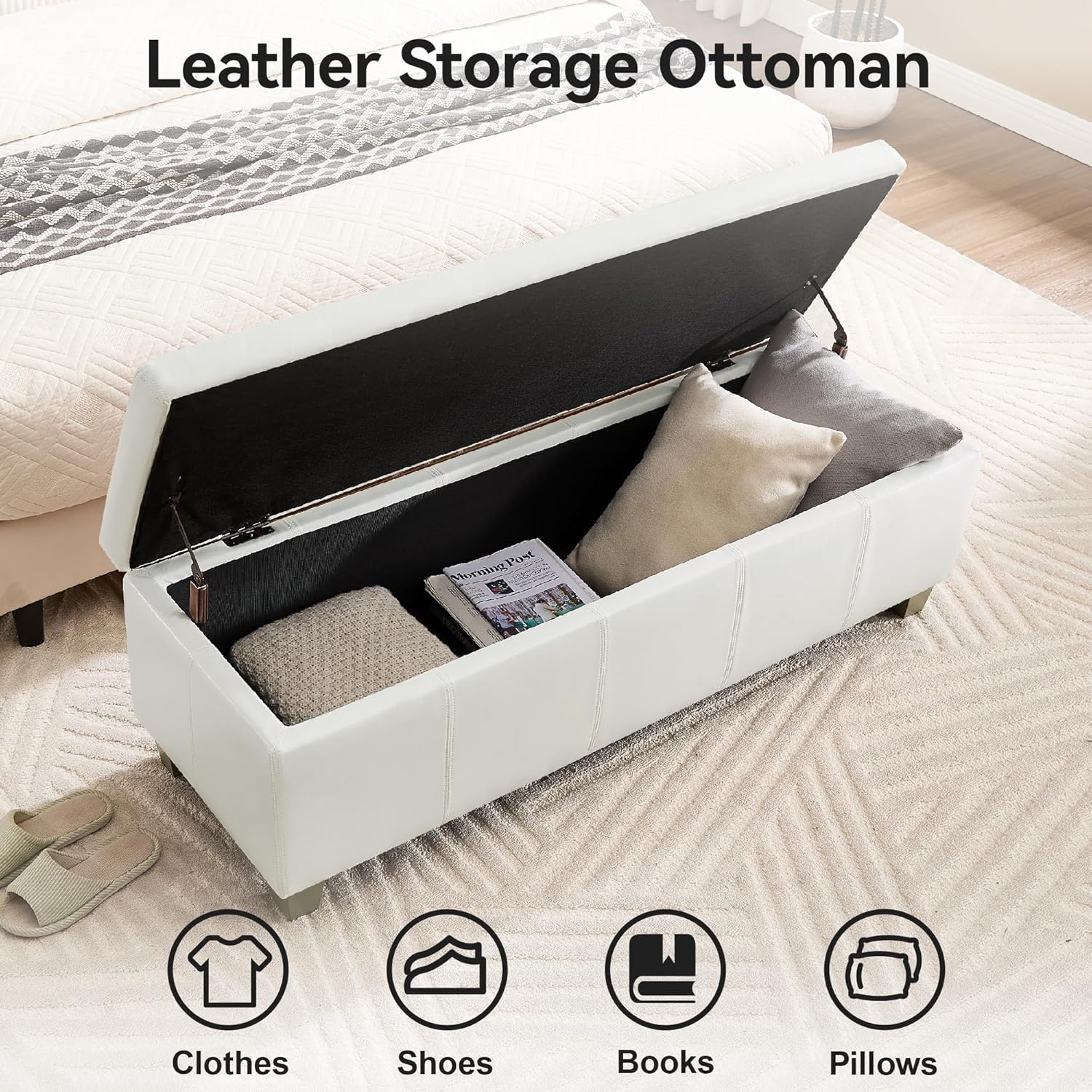 41" Faux Leather Storage Ottoman, Stitch Tufted Rectangle Upholstered End of Bed Storage Bench, Entryway Large Couch Ottoman with Wooden Legs,White