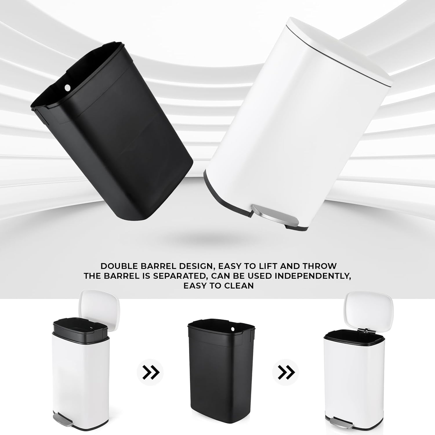 - Quiet Closing&Lid-lock: Heavy-duty garbage can is built with integrated step pedal mechanism and the force damper, which soft open and close lid while preventing slamming and banging. Lid-lock can help keep trash can open without stepping if you are inconvenient to keep stepping on pedal.
