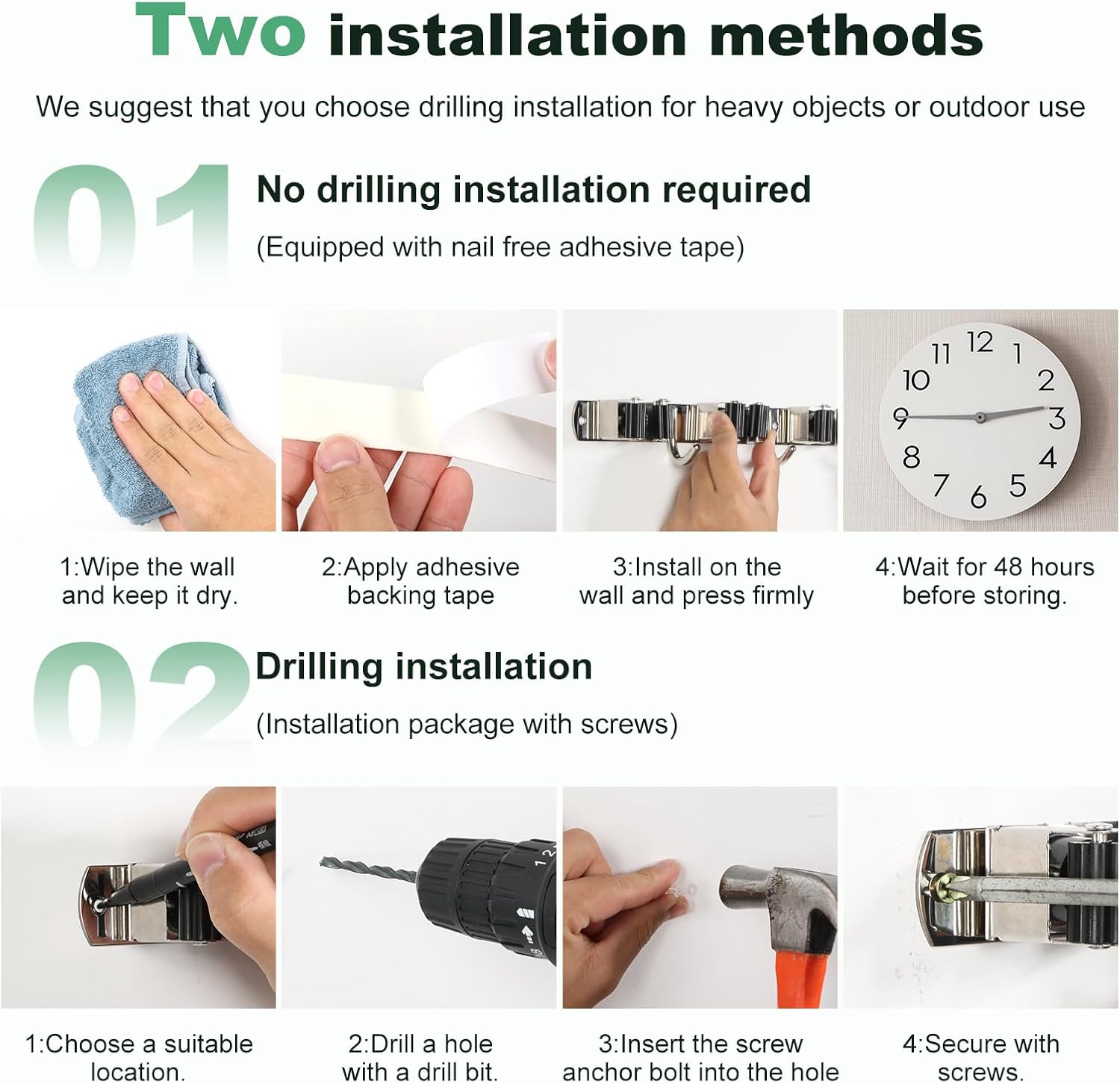 - 2 Mounting Methods: We have designed 2 methods of mounting the mop holder for different mounting surfaces. Self adhesive no punch wall mount for smooth surfaces and screw drilled wall mount for rough surfaces