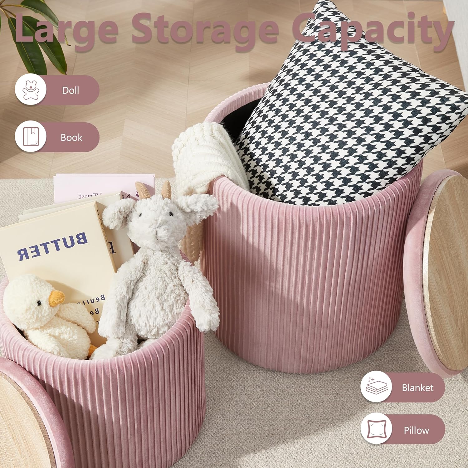 - 【Ample Storage Space】Both the large and small ottomans offer generous storage capacity. You can place them in the entryway to store shoes, in the living room for blankets and throw pillows, in the children's room to organize toys, or in the dressing room for cosmetics, bags, and other essentials.