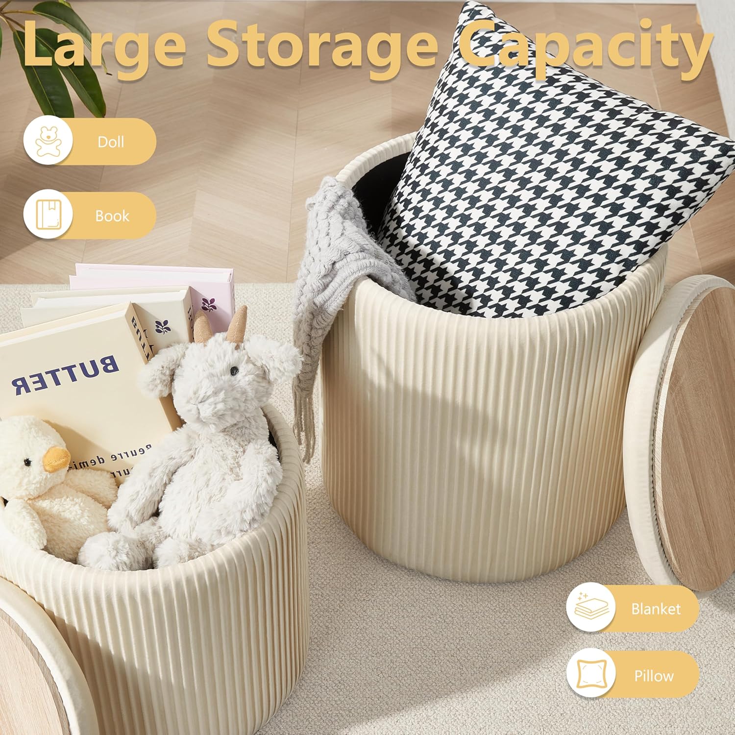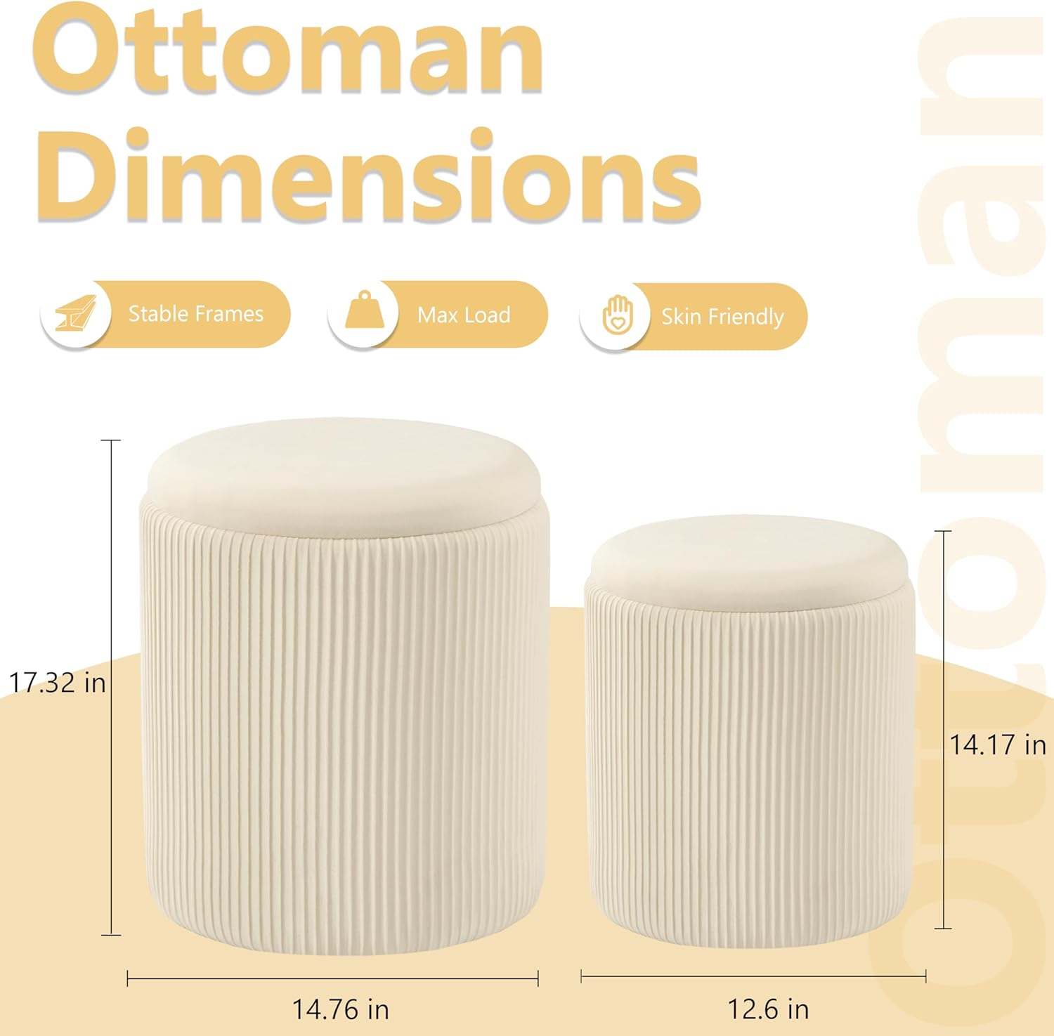 Round Ottoman with Storage Set of 2,Vanity Stool with Storage for Bedroom, Ottoman Coffee Table,Small Velvet Foot Stool for Living Room, Beige