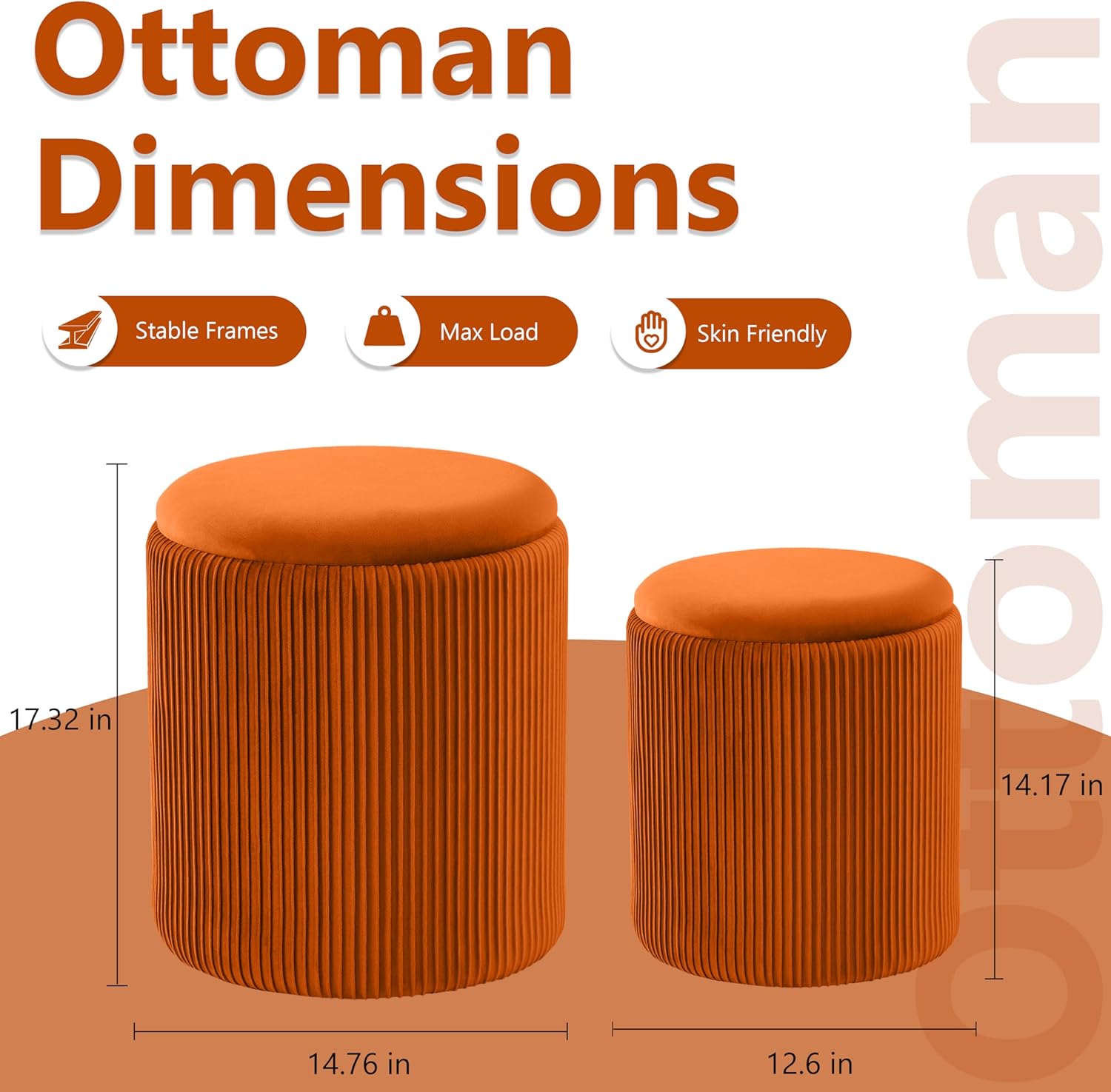 Round Ottoman with Storage Set of 2,Vanity Stool with Storage for Bedroom, Ottoman Coffee Table,Small Velvet Foot Stool for Living Room, Orange