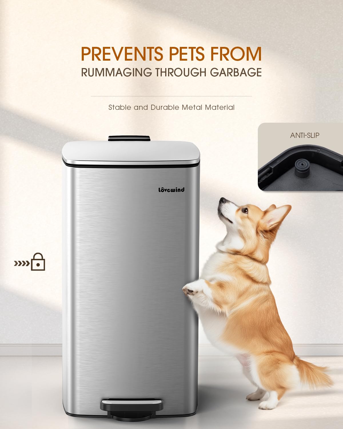 Lovewind Kitchen Trash Can with Lid, 8 Gallon/30 L Footstep Garbage Can for Kitchen Bedroom Home Office, 30 Liter Trash Bin Brushed Stainless Steel Waste Bin with Soft-Close Lid,Silver