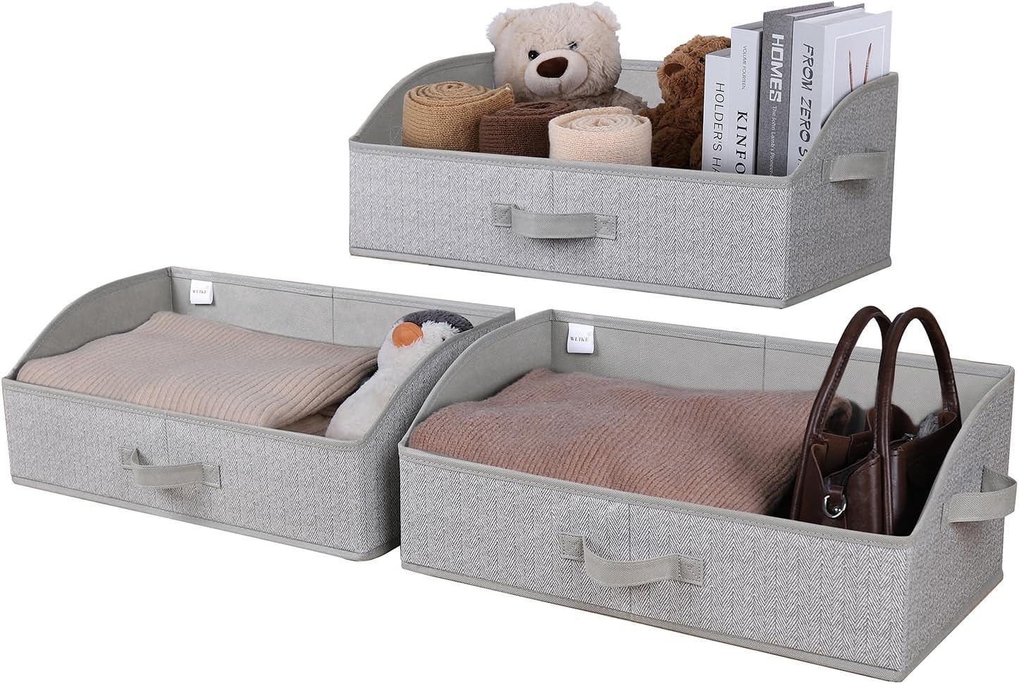 - Large Capacity & Sturdy Build: Measuring 19.5" (L) x 11" (W) x 8" (H/back) / 4.7” (H/front) with a 28L capacity, these closet baskets for shelves are reinforced with cardboard to resist deformation.
