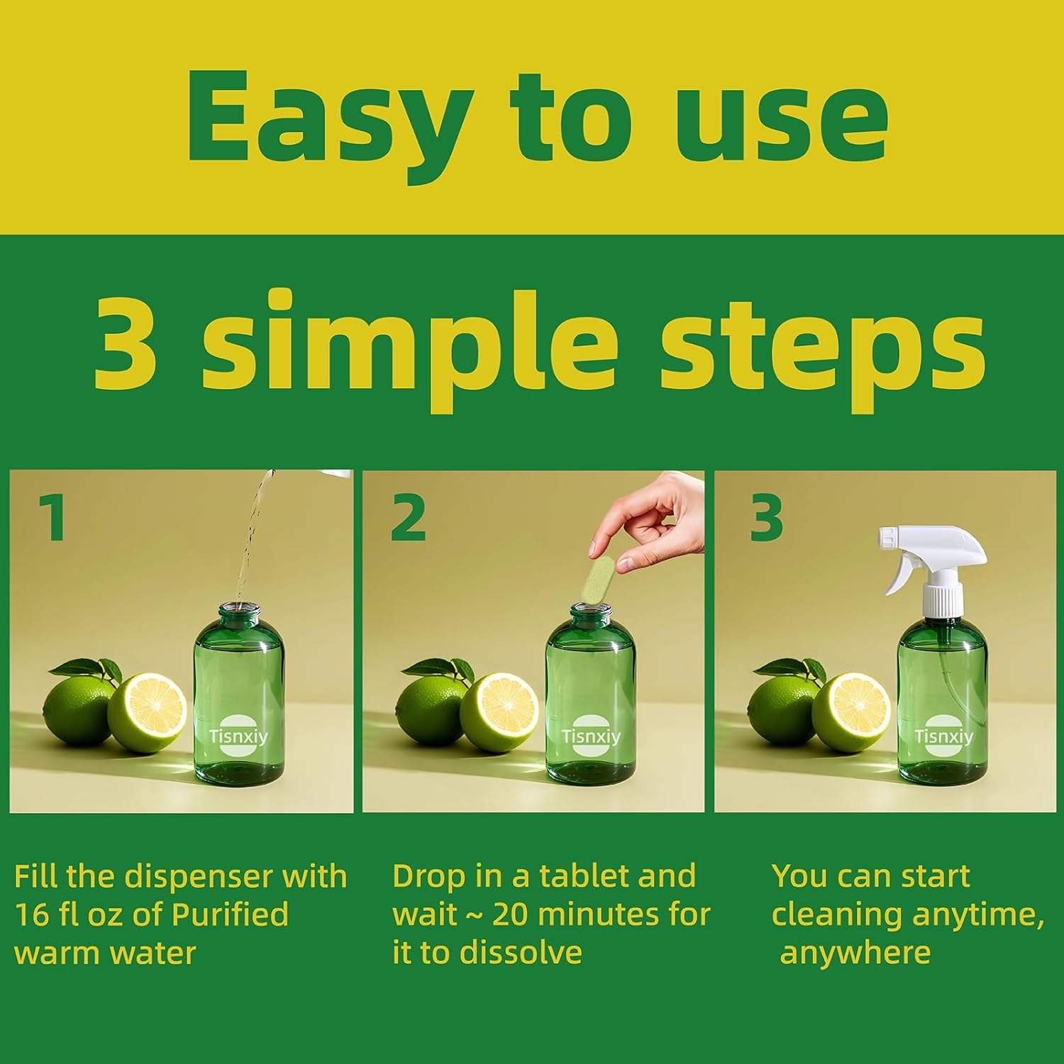 - Easy to Use: Our multi-surface cleaner tablet is a breeze. Simply drop a tablet into a spray bottle filled with water, wait for it to dissolve completely, and you're ready to tackle any cleaning task. The convenient tablet form makes storage and handling effortless, saving space in your cleaning cupboard too.