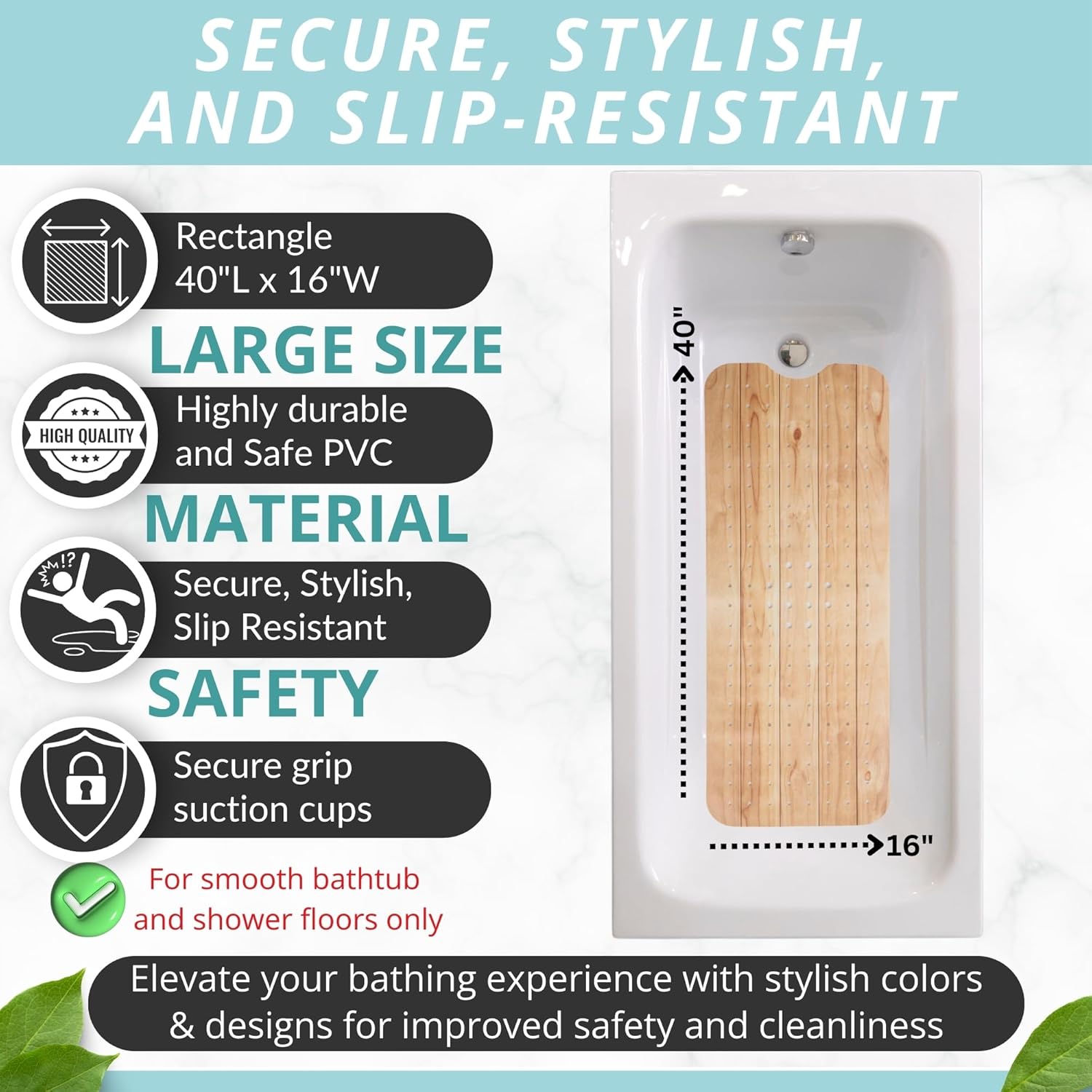 - DURABLE HIGH-QUALITY MATERIAL Crafted from durable safe PVC materials to withstand daily use and maintain quality. Resistant to wear and tear, ensuring longevity and continued effectiveness and safety (Suitable for use in smooth non-textured bathtubs, showers, only)