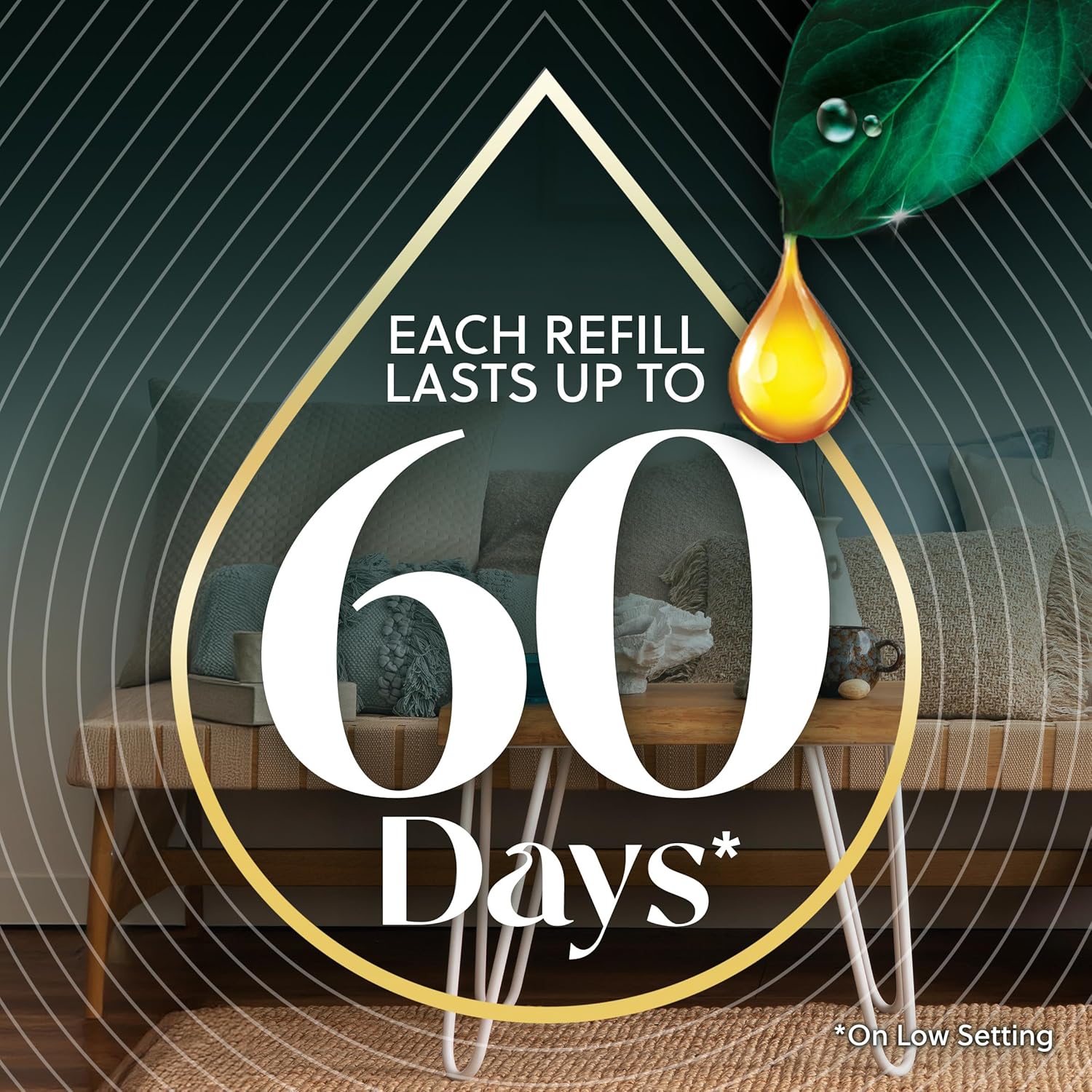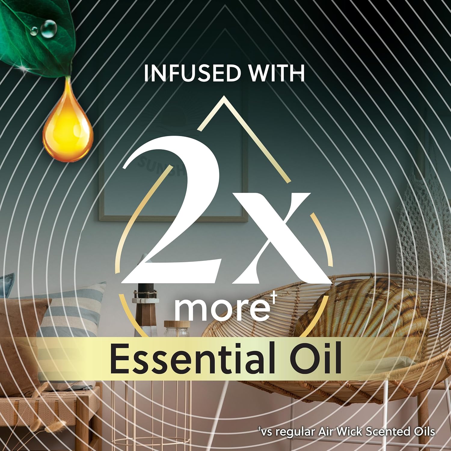 - Enhance your home’s scent with Air Wick Scented Oil Refills with continuous fragrance for up to 60 days (based on low setting). Our air freshener plug in refills are infused with 100% natural essential oils. Our latest Air Wick scented oil warmer optimizes airflow for 360-degree fragrance diffusion, reaching every corner of the room for a consistent fragrance experience. The Air Wick Scented Oil warmer allows you to choose between 5 fragrance settings for just the right amount of fragrance. It continuously diffuses and carefully blends fragrance throughout your home, office, or any space.