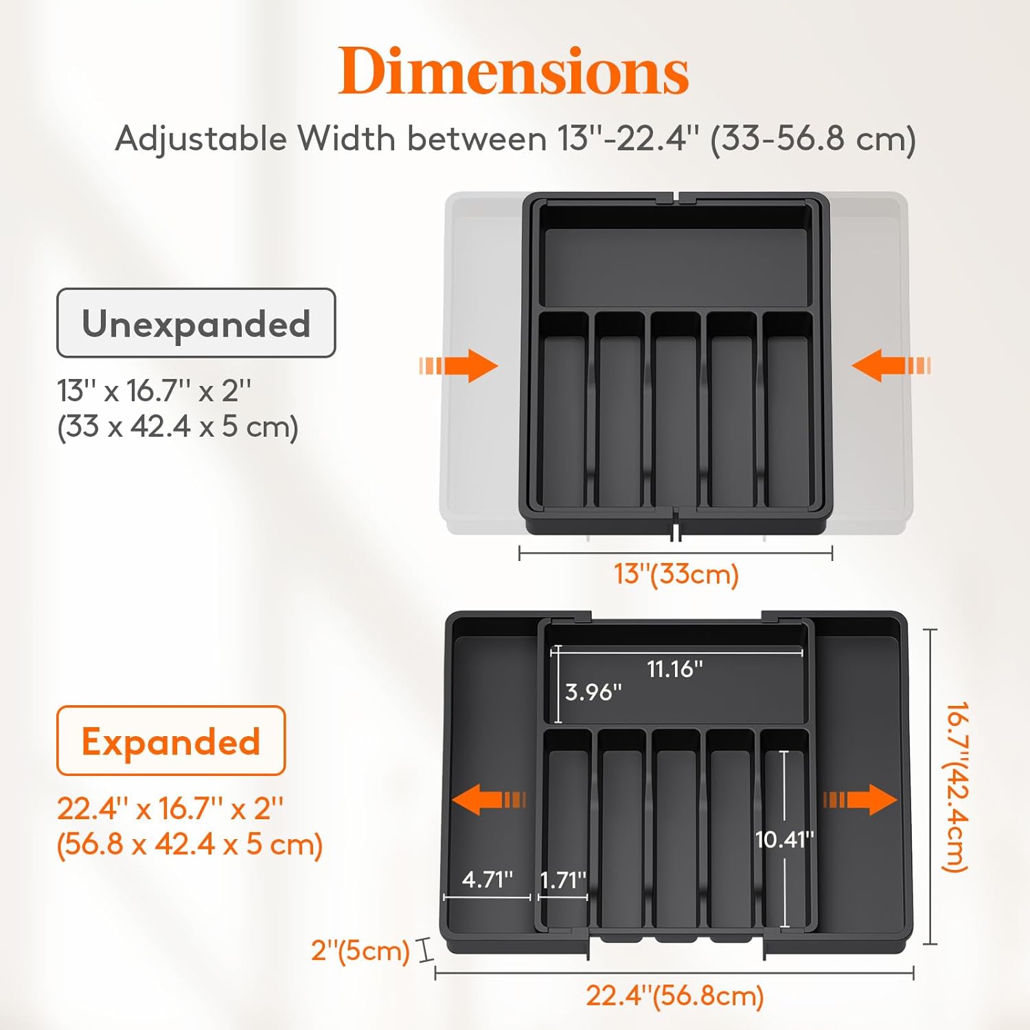 - Adjustable Design: With its retractable design, The Lifewit silverware organizer fits drawers of various sizes and shapes. It measures 13'' wide when folded while reaching 22.4'' when fully expanded. This universal utensil drawer organizer helps you maximize storage space efficiently while keeping your utensils neatly organized and easily accessible