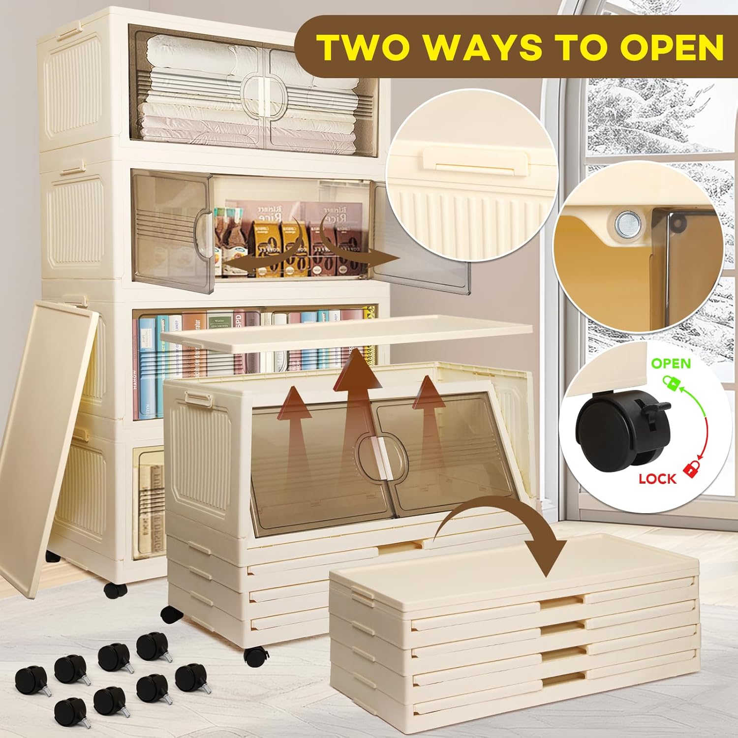 - 【Multiple Combination Ways】The storage bins comes with 2 lids and 8 wheels, you can choose to assemble it into a 4-tier organizer with wheels or two 2-tier organizers with wheels according to your needs.