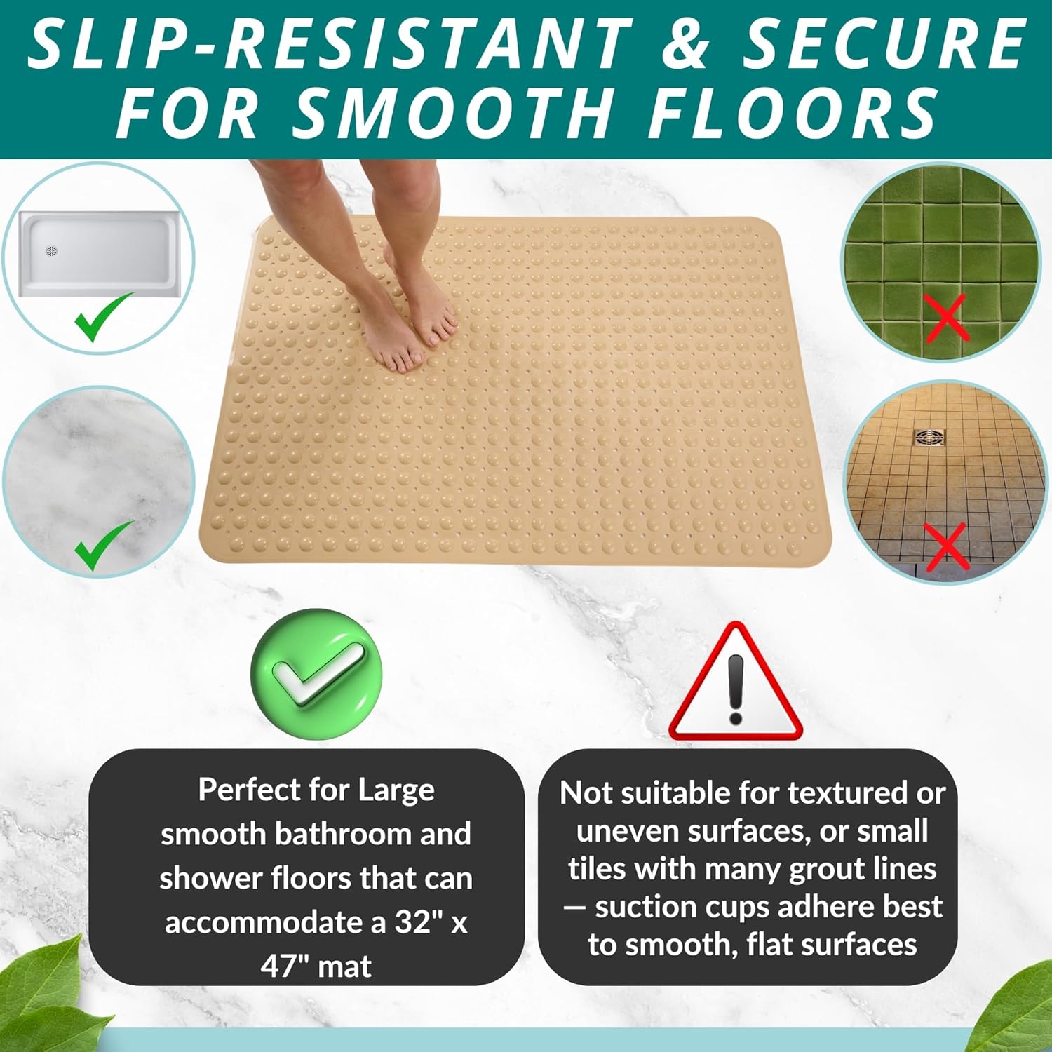 - COMFORTABLE and DURABLE, made of safe PVC material, secure protection for yourself, your kids, and elderly parents or grandparents. PLEASE NOTE THE SHOWER MAT IS SUITABLE FOR SMOOTH, NON-TEXTURED SURFACES ONLY