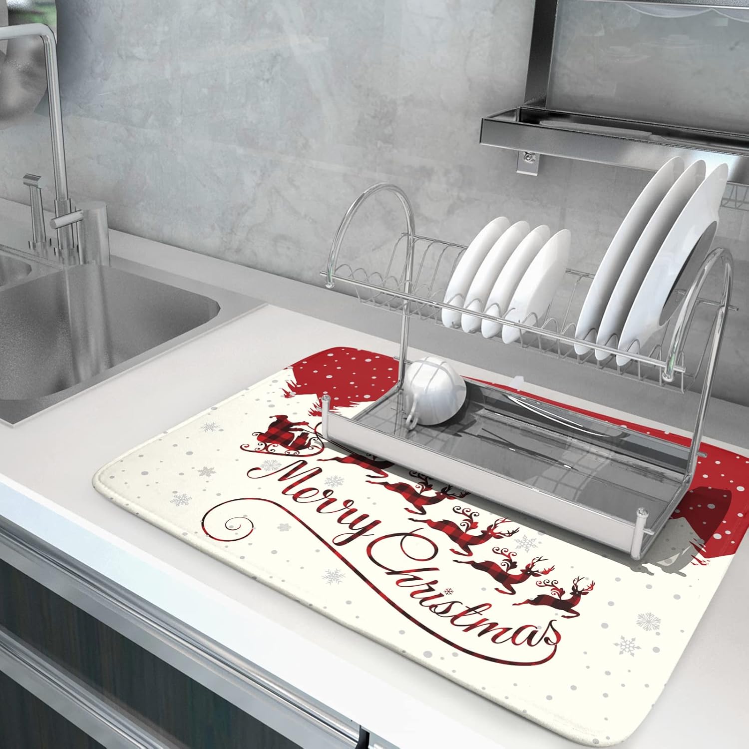 - Dish drying mat size: 16x18 inches, high quality polyester Christmas Reindeer dish drying mat. Made of microfiber,super absorbent and fast drying dish drying mat. Absorbent microfiber, in a 3-layer design without sacrificing its softness. Both sides can be used, one with a beautiful Snowflake and Santa Claus pattern, the other with a gray non-slip bottom. Santa drying Mat for Coffee Bar Countertops fits most countertops while providing a smart, sharp look.