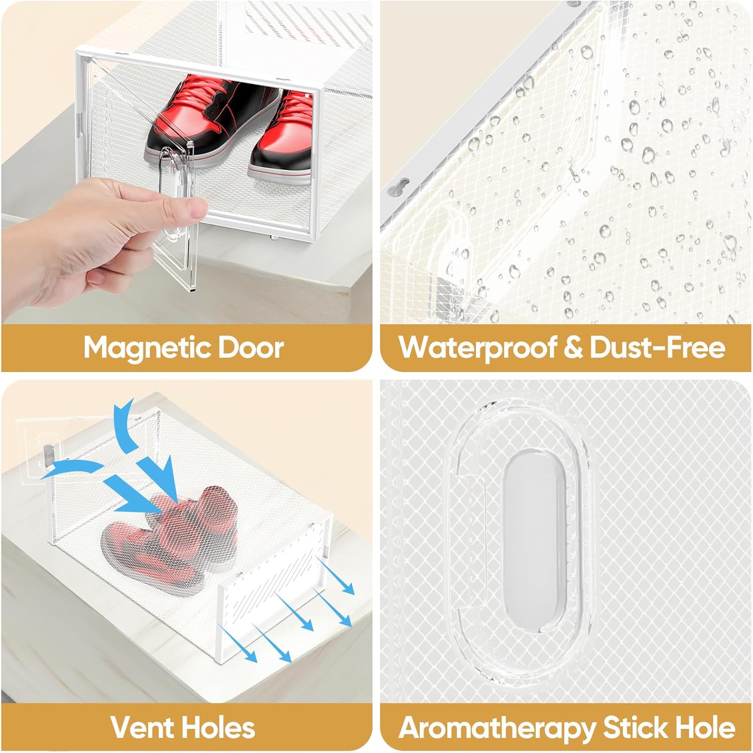 - [UPGRADE VERSION] Larger Space + Magnetic Door + Ventilation Holes + Aromatherapy Stick Hole + Thickened Material. This shoe box offers ample space for your shoes, along with a designated slot for an aromatherapy stick(not included). The door's magnetic closure provides a secure seal to prevent accidental opening.