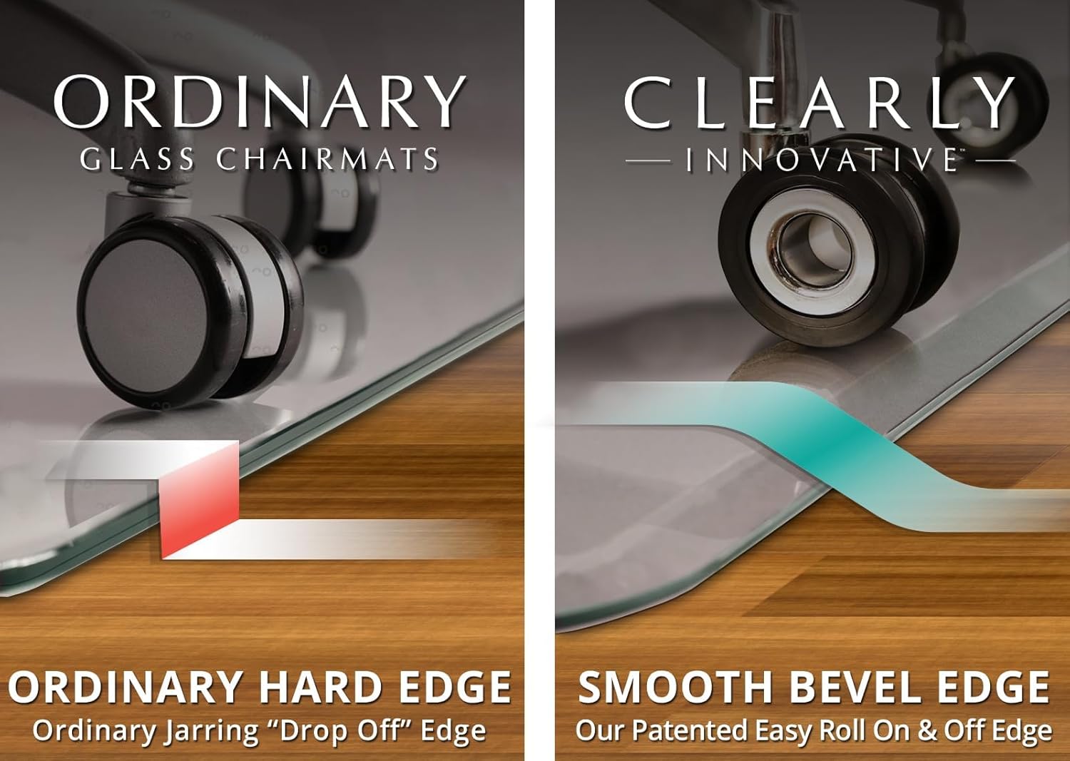 - 𝗣𝗥𝗘𝗠𝗜𝗨𝗠 𝗖𝗛𝗔𝗜𝗥 𝗠𝗔𝗧 - Clearly Innovative set out to create the best ¼” thick tempered glass chair mats on the market and have done so with their exclusive patented beveled-edge design that provides a smooth transition from our premium glass mat to carpet or hard floors and is matched by no other manufacturer.