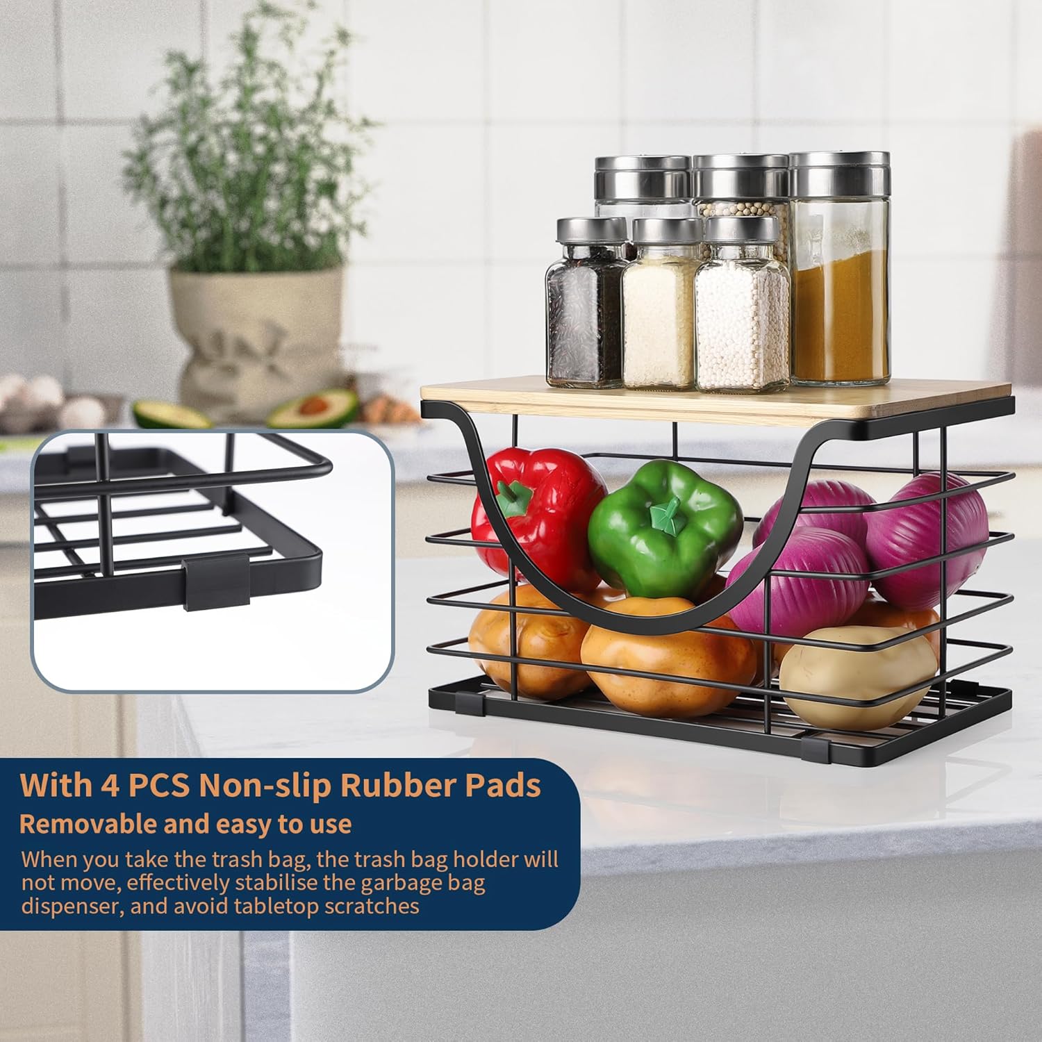 - High Quality and Fine Workmanship - Trash Bag Holder Dispenser is made of stainless steel basket and bamboo lid, corrosion and rust resistant, smooth edges, sturdy and durable. Hollow out design allows you to see the household items inside, easy to check your trash bag and replenish it at any time