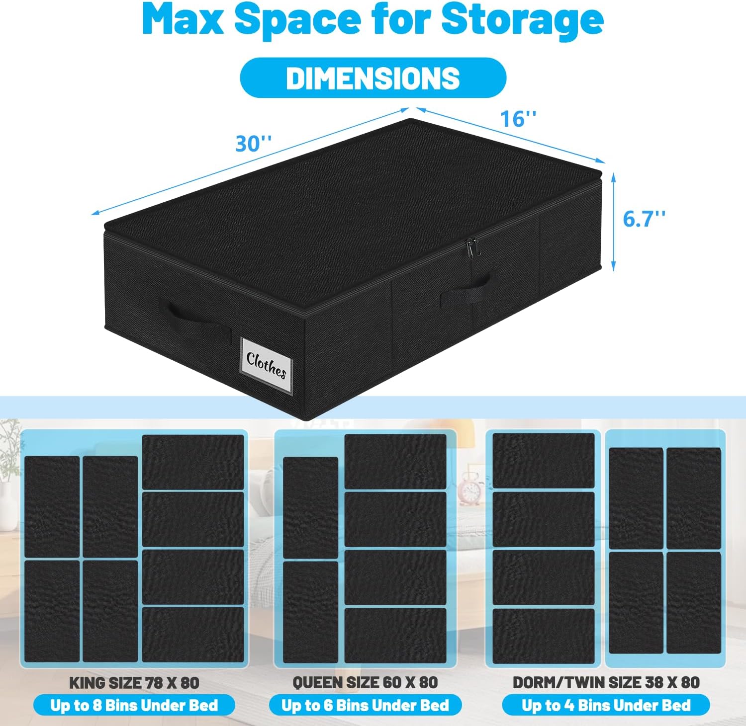 - Spacious Design with Ample Capacity: Measuring 30" x 16" x 6.7", the under bed storage containers of the Space series provide ample space for clothes, comforter, bedding, shoes, toys and blanket storage. Their large capacity is ideal for keeping your room clutter-free, while the low profile under bed storage ensures they fit effortlessly under beds and sofas, making them a versatile solution for closet organizers and storage.
