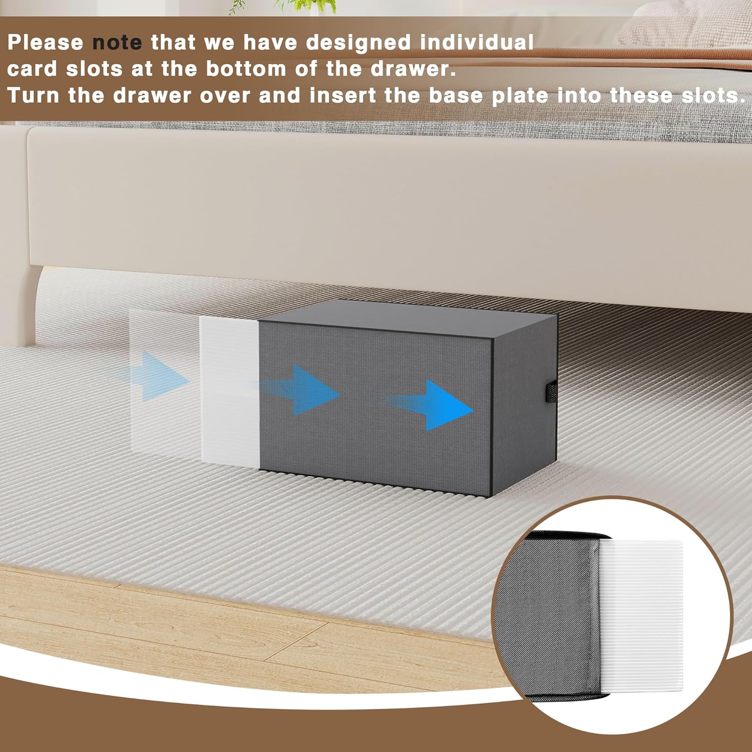- Please note that we have designed individual card slots at the bottom of the drawer. Turn the drawer over and insert the base plate into these slots.
