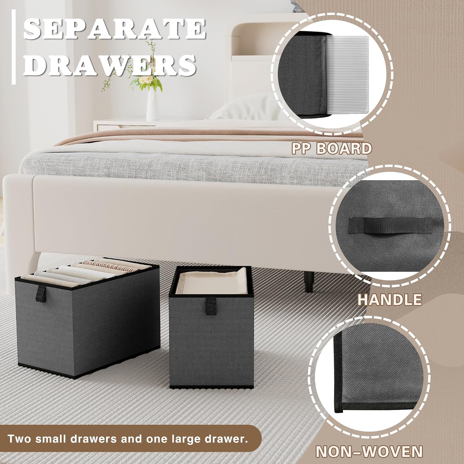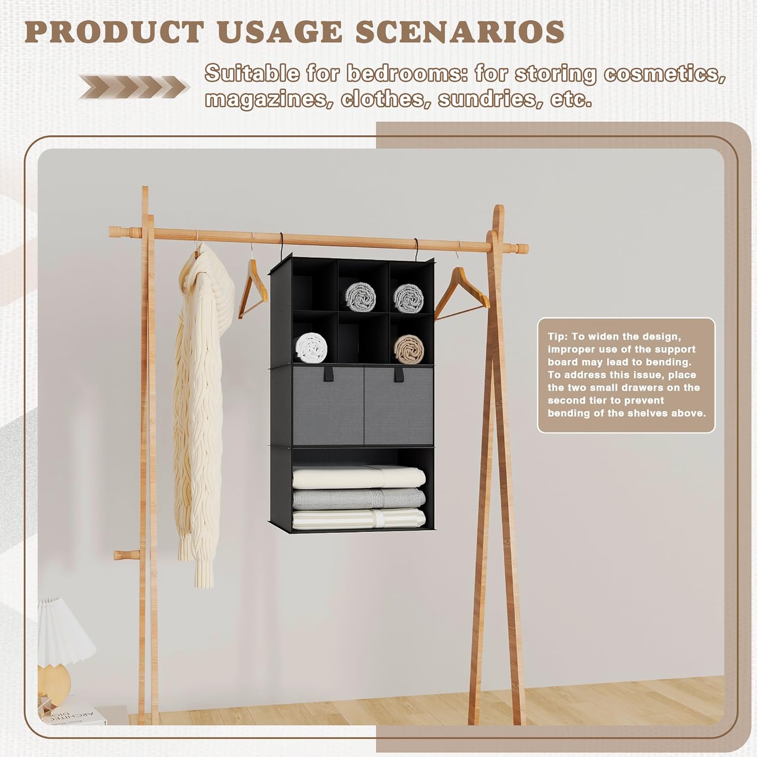 - Tip: To widen the design, improper use of the support board may lead to bending. To address this issue, place the two small drawers on the second tier to prevent bending of the shelves above.