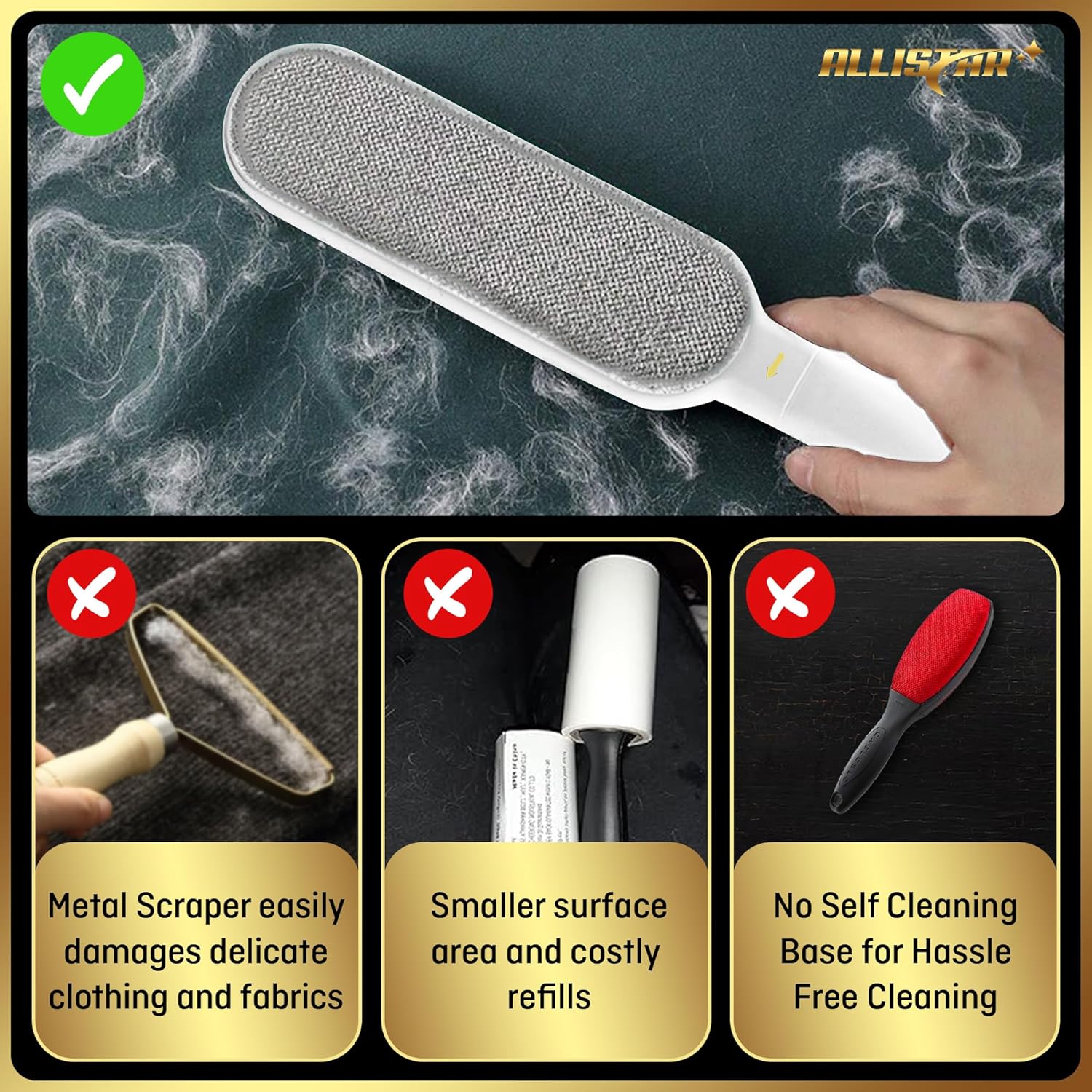 - DOUBLE SIDED ACTION - Larger sized brush allows for faster removal of unwanted pet fur and lint; The electrostatic design is gentle enough on delicate fabrics but strong enough to tackle tough cleaning jobs. ALLISTAR’s lightweight design can go anywhere you go and has a handle that can be suspended on a hook for a great storage space saver.