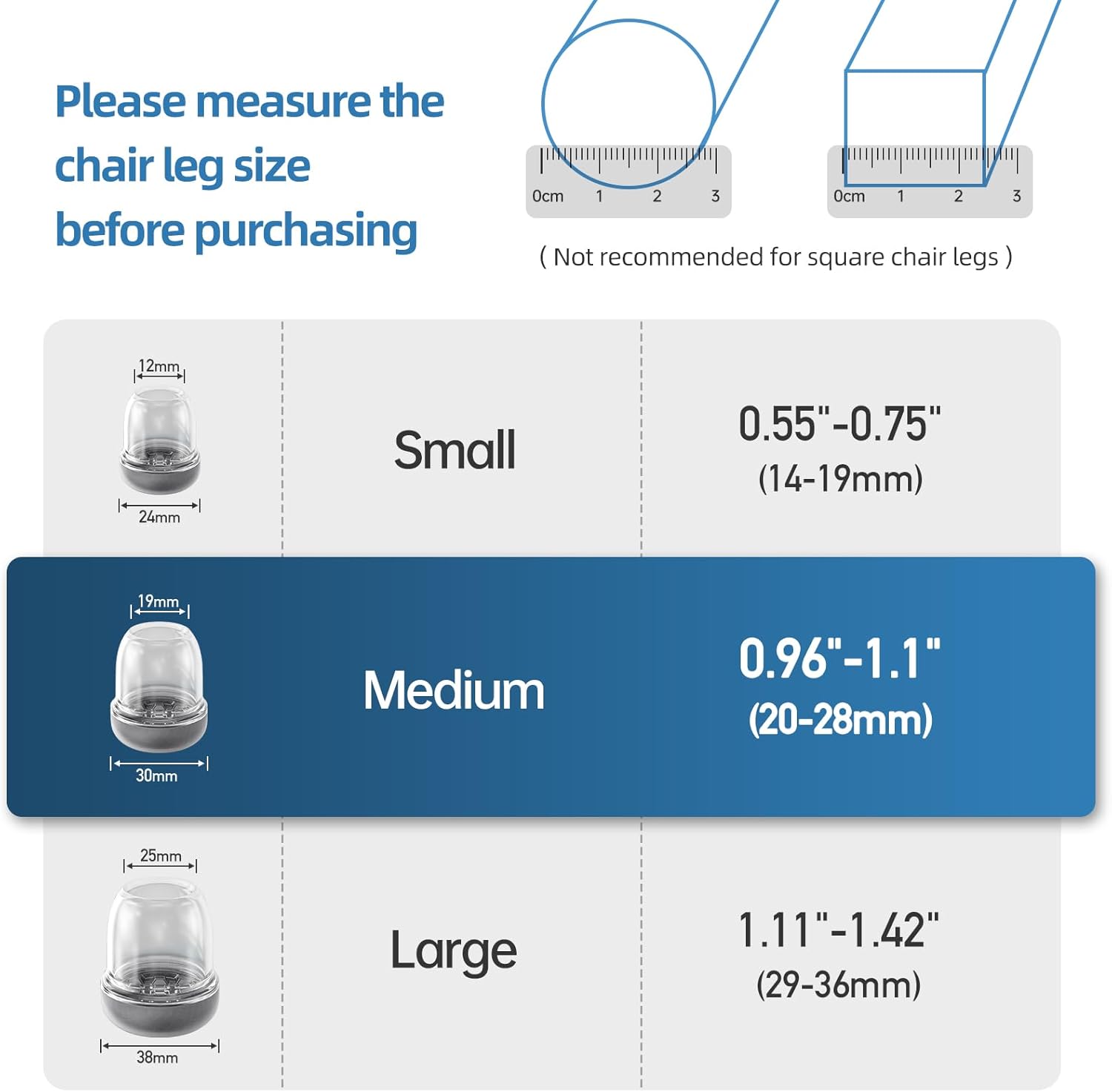 - [Multiple size options] Chair Leg Caps are elastic and can better adapt and fit the chair legs. We have three sizes (suitable chair leg diameter/side length: 0.63''-0.79''16-20mm ,0.83''-1.02''21-26mm ,1.10''-1.30''28-33mm) Warm reminder: Please carefully measure the diameter of the chair legs before ordering.
