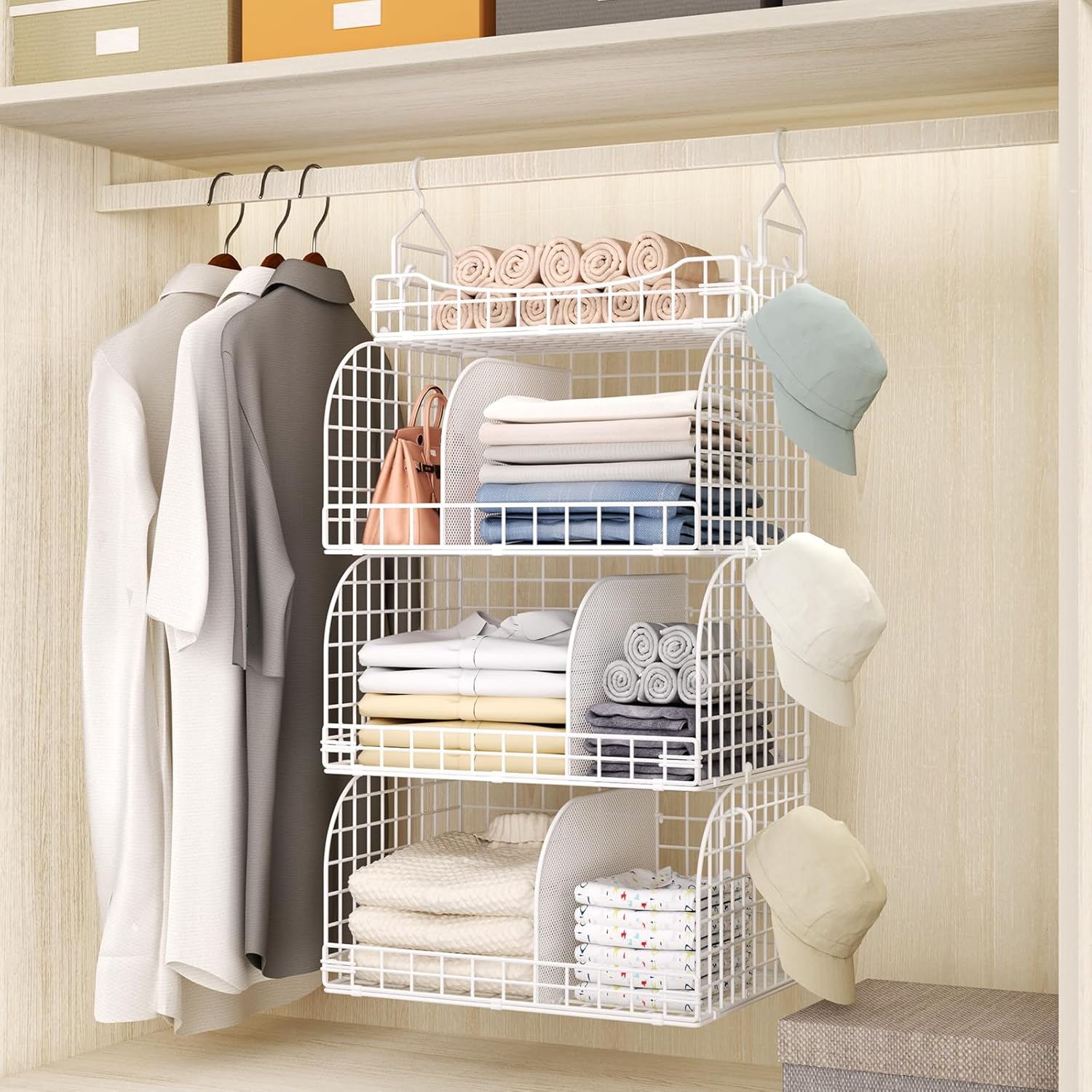 HapiRm Hanging Closet Organizer Storage - 3 Tier Metal Stackable Hanging Closet Shelves with Dividers and S Hooks, Foldable Clothes Shelves for Clothes, Pants, Shoes, Coat, Hats Clutches Accessories