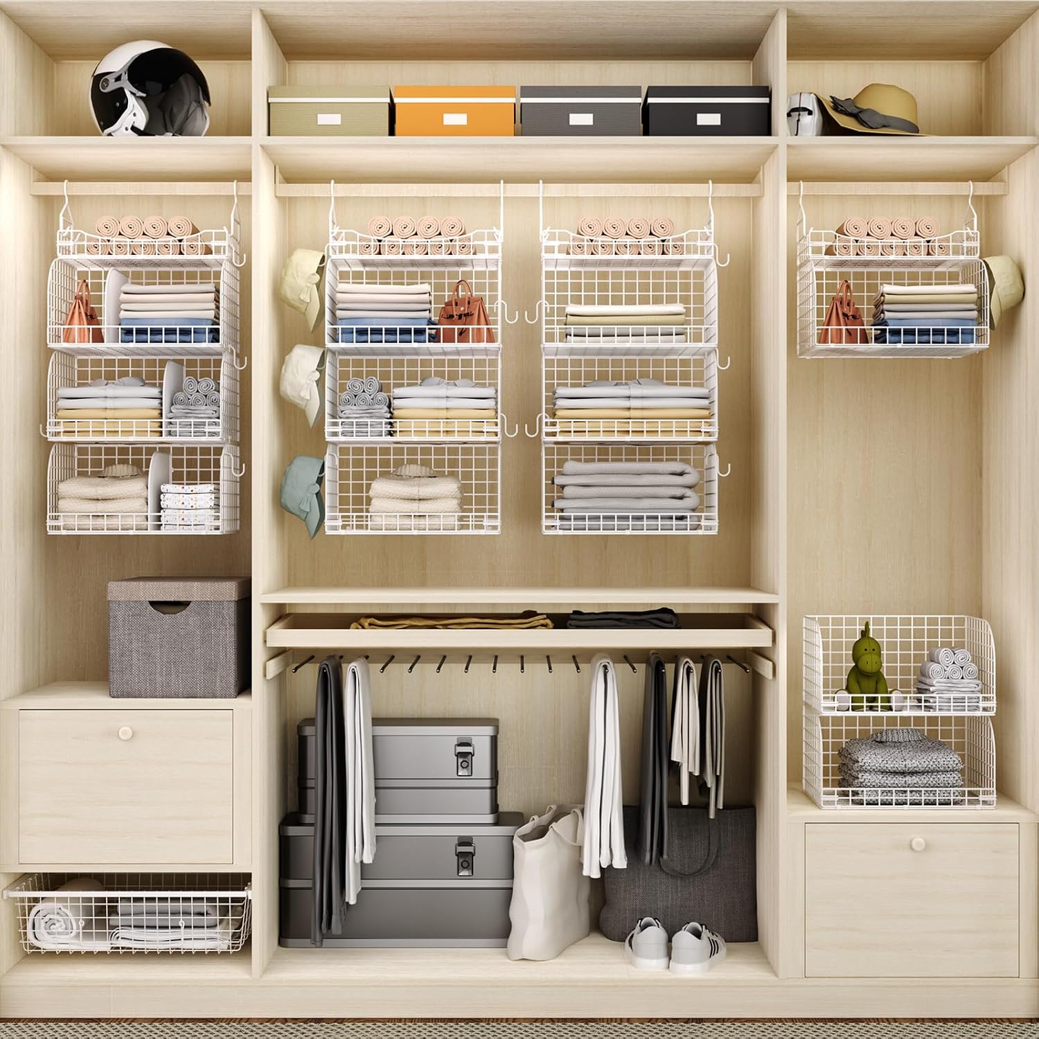 - [Adjustable Dividers for Custom Storage]: Designed with customizable dividers, this closet storage organizer allows you to organize various items, such as clothes, hats, sweaters, jeans, shirts, shoes, purses and other accessories, to maximize your closet hanging organizer space. Ideal for personalized storage needs