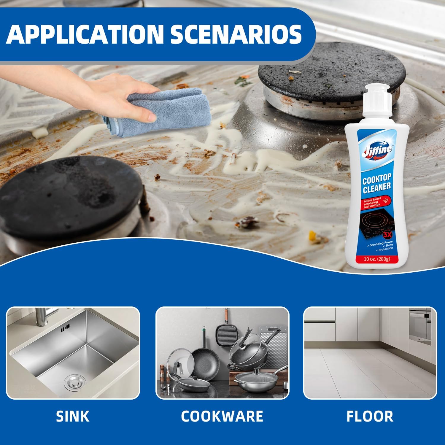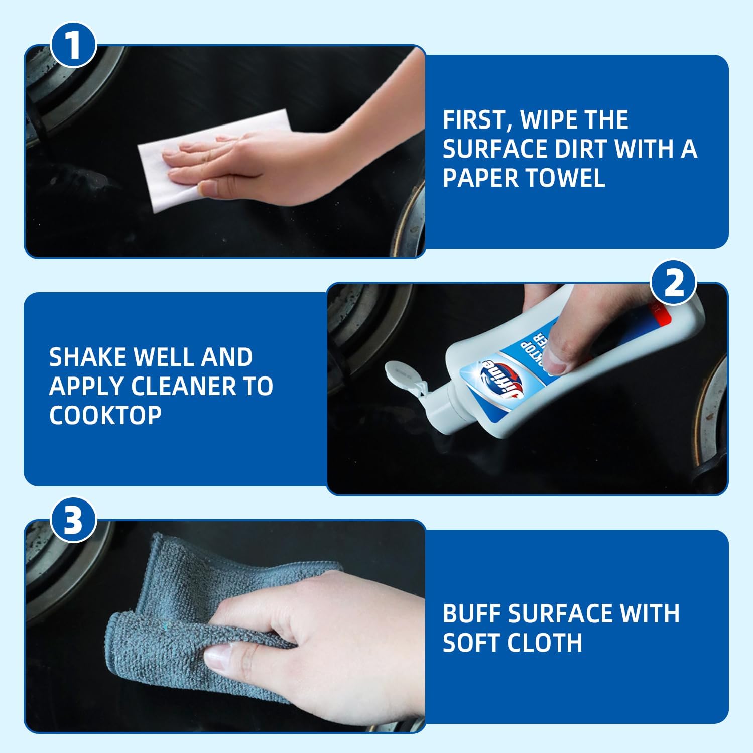 - Powerful Cleaning & Polishing:Our specially formulated cleaner easily removes grease, grime, and common stains from your stovetop. For everyday messes, simply apply and wipe—no extra tools required. Enjoy a streak-free, polished finish every time!