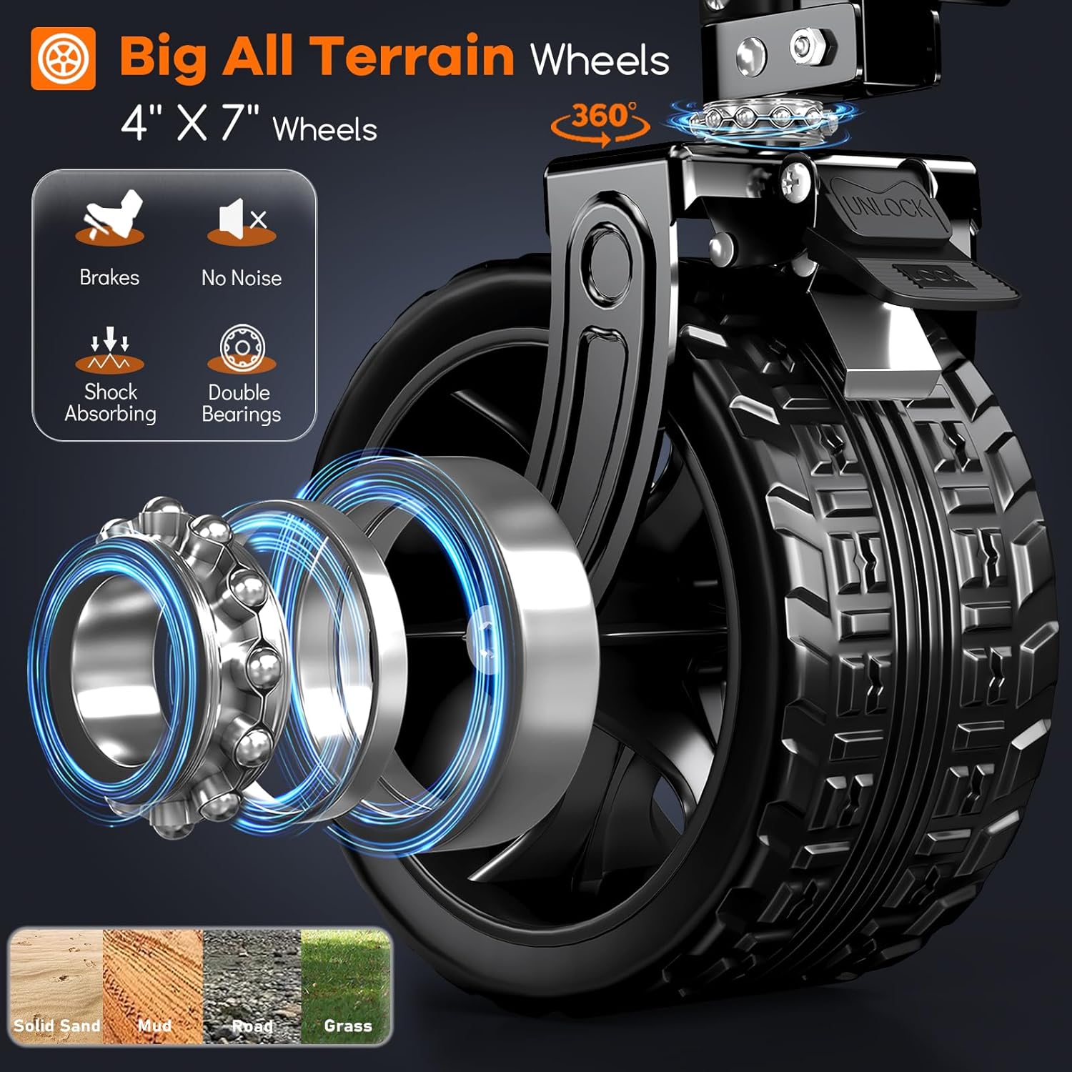 - 【𝟯𝟲𝟬°𝗥𝗼𝘁𝗮𝘁𝗶𝗼𝗻 𝗨𝗻𝗶𝘃𝗲𝗿𝘀𝗮𝗹 𝗔𝗹𝗹-𝘁𝗲𝗿𝗿𝗮𝗶𝗻 𝗕𝗶𝗴 𝗪𝗵𝗲𝗲𝗹𝘀 𝘄𝗶𝘁𝗵 𝗕𝗿𝗮𝗸𝗲𝘀, 𝗦𝘂𝗶𝘁𝗮𝗯𝗹𝗲 𝗳𝗼𝗿 𝗩𝗮𝗿𝗶𝗼𝘂𝘀 𝗥𝗼𝗮𝗱 𝗦𝘂𝗿𝗳𝗮𝗰𝗲𝘀】This beach carts features 4 larger and wider 7"x4" double bearings all-terrain big wheels, allowing for flexible steering and smooth rolling on various road surfaces such as mud, grass, and hard sand. The two 360° rotation front wheels with brakes, effectively to stop and prevent the wagon from moving. It' s shock-absorption and noise-reduction, ensuring durability and resistance to wear and tear.
