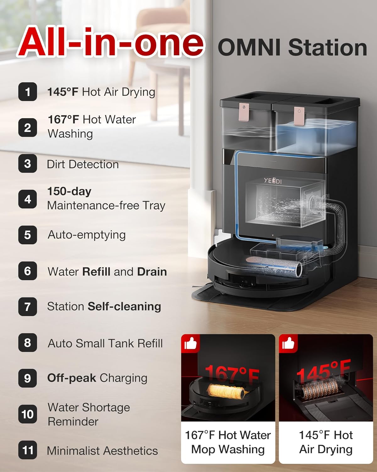 - ✨OMNI Smart Station—Cleaning Maintenance Made Effortless - Let the OMNI Station handle the hard work: it washes your mop with steaming 167℉ water, dries it at 145℉, empties dust automatically, and refills water—so you can spend less time cleaning and more time living, with all maintenance visible and simple.
