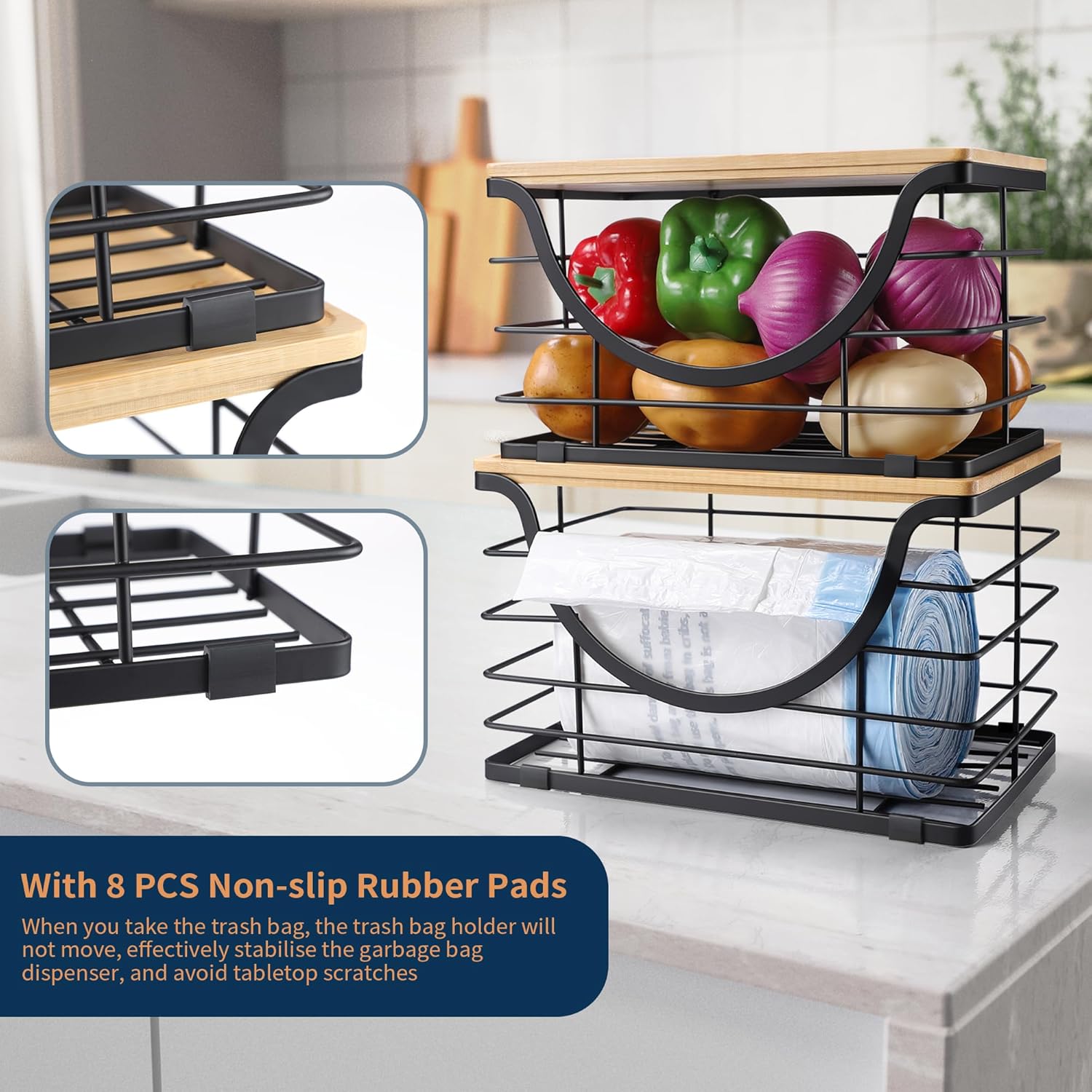 - 2 Ways to Use -stackable wire basket with bamboo top can be used on a tabletop or self-adhesive wall mounted. No need to drill holes, won't damage the wall. Multi-functional Garbage Bag Storage Dispenser is suitable for kitchen, laundry room, toilet, under the sink, cabinet, etc., you can store laundry supplies, cleaning supplies, vegetables and fruits, snacks and so on