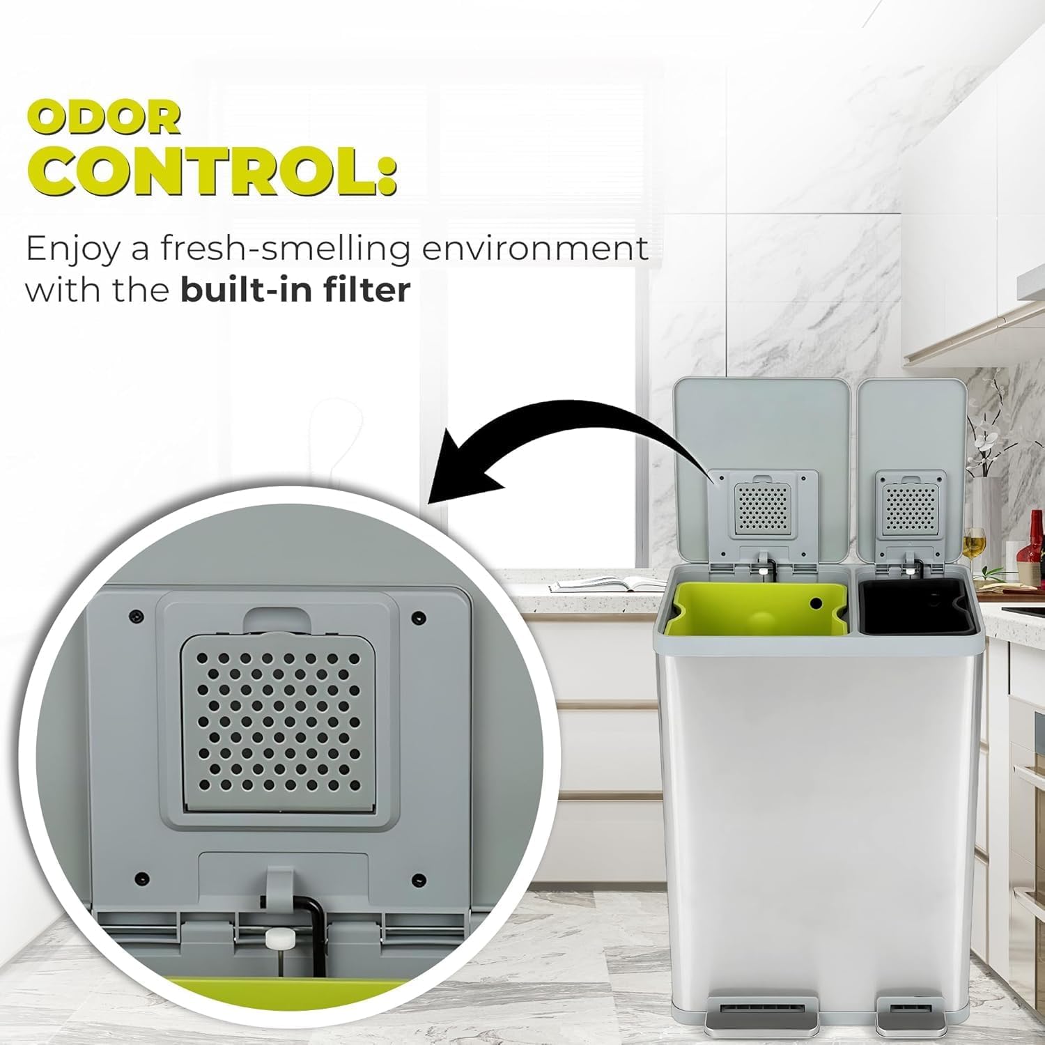 - HIGH CAPACITY WASTE AND RECYCLING SOLUTION: Color coded liners in Green (38L) and Black (22L) allow for easy sortation of waste and recycling, without sacrificing waste capacity, and fit standard liners using bag cinch.