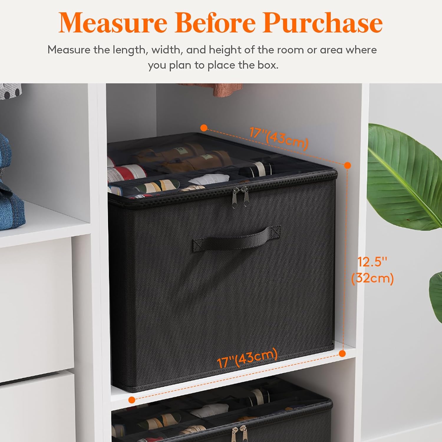 - Spacious Capacity: This 17"x17"x12.5" (43x43x32cm) shoe organizer holds 12-16 pairs. It features 8 small (11x11cm) and 4 large (21x14cm) compartments for all footwear types. Measure the length, width, and height of the room where you plan to place the box